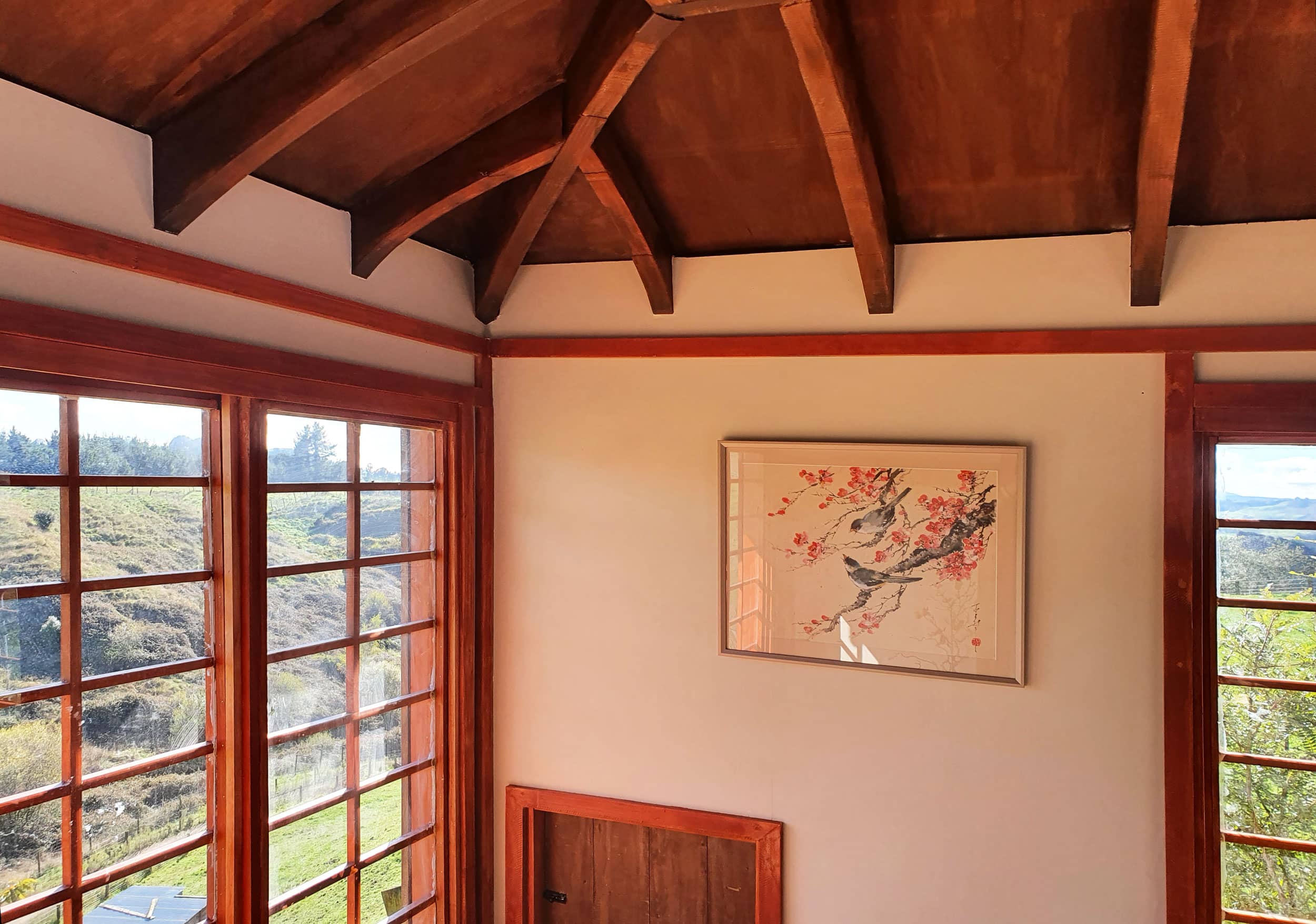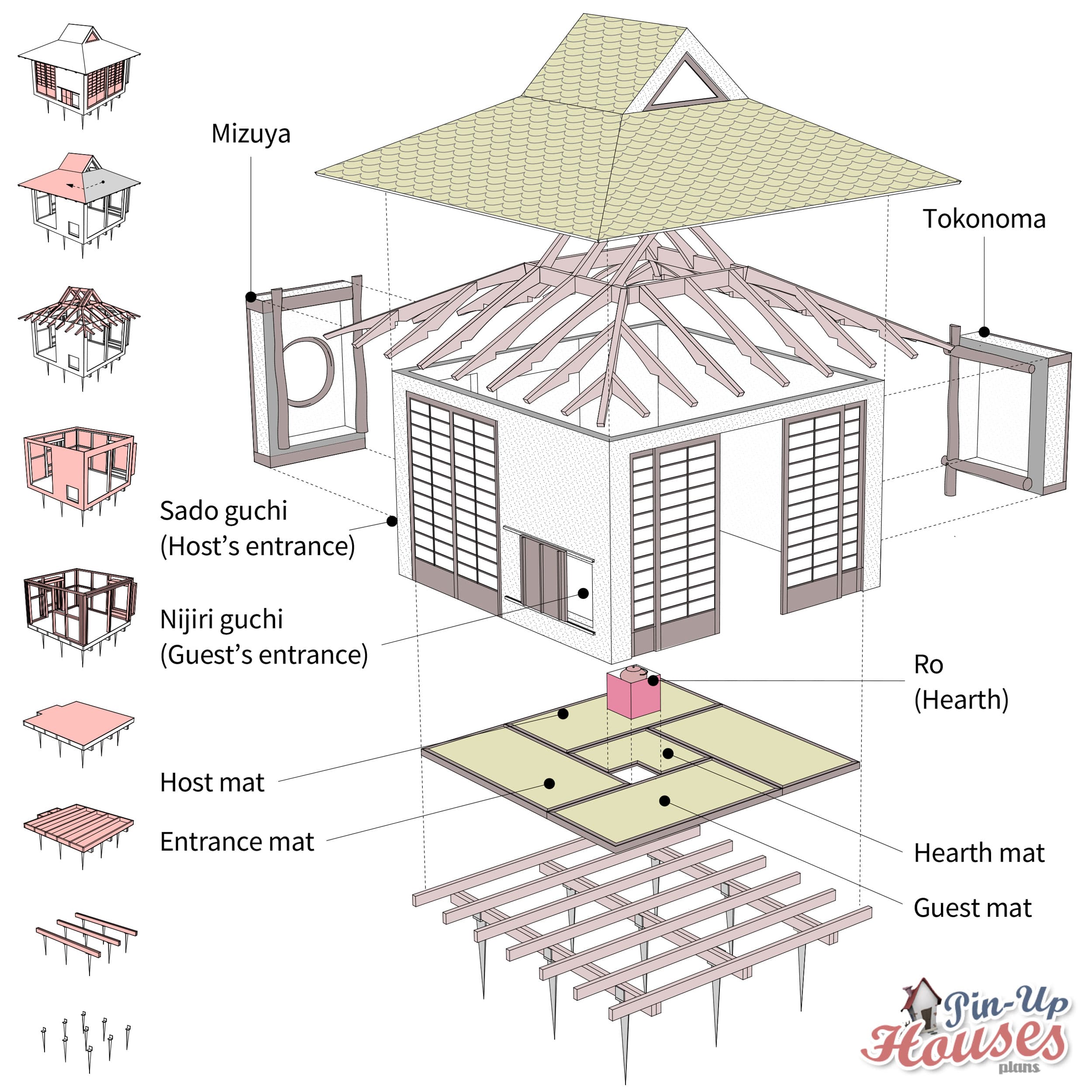The initial idea was to build a garden summer hut, perched on a hill in the garden. With strong prevailing winds on that specific location, it was always going to be a problem sitting there and enjoying the view. I considered different ideas, such as movable walls to protect us from the varying wind directions. I found a picture in a Japanese garden book which was more of an enclosure, but I struggled with the “how-to”. Searching on the Internet, I found the “perfect-looking” teahouse, which took me to Pin-Up Houses website.