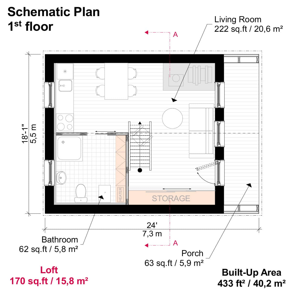 | L X W | 18′-1" x 24′ / 5,5 m x 7,3 m |