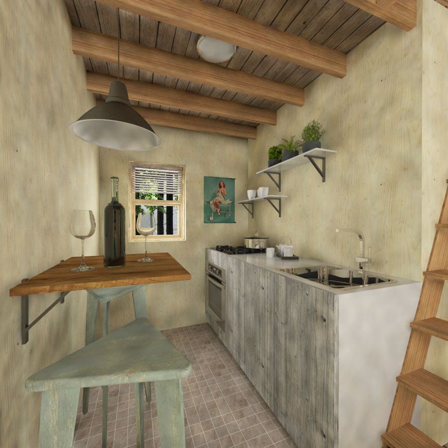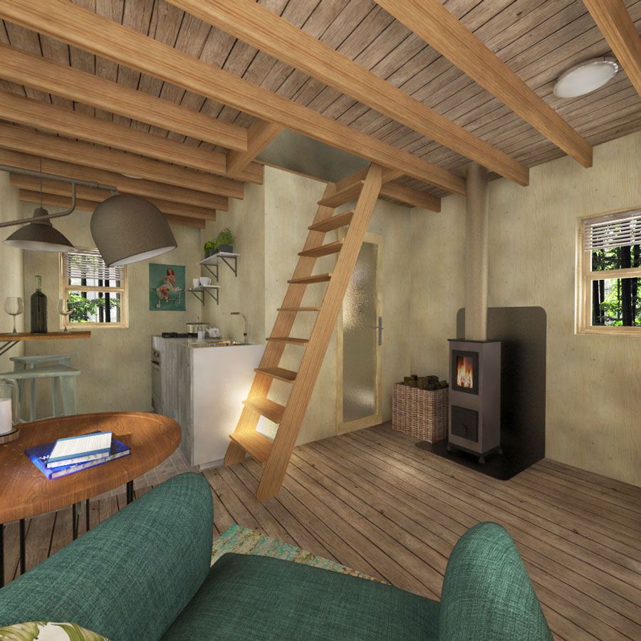 The simple design of the cabin Karen is just charming. A basic package of everything you’re looking for in a small cottage with a romantic gabled roof and a porch. It has one bedroom where all the needed fits once carefully positioned; it has been optimized to the maximum. Within the built-up area of 24,5 m² / 264 sq.ft, you enter the main room. That’s open right to the kitchen area and through the door to the minimalistic bathroom. Karen’s cabin also has an upstairs bedroom itself. Can you wait to read a book in the silent ambient on the porch? Why not build up one for yourself with the Pin-Up Houses!