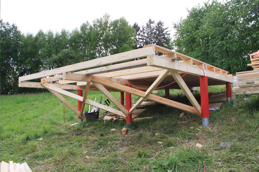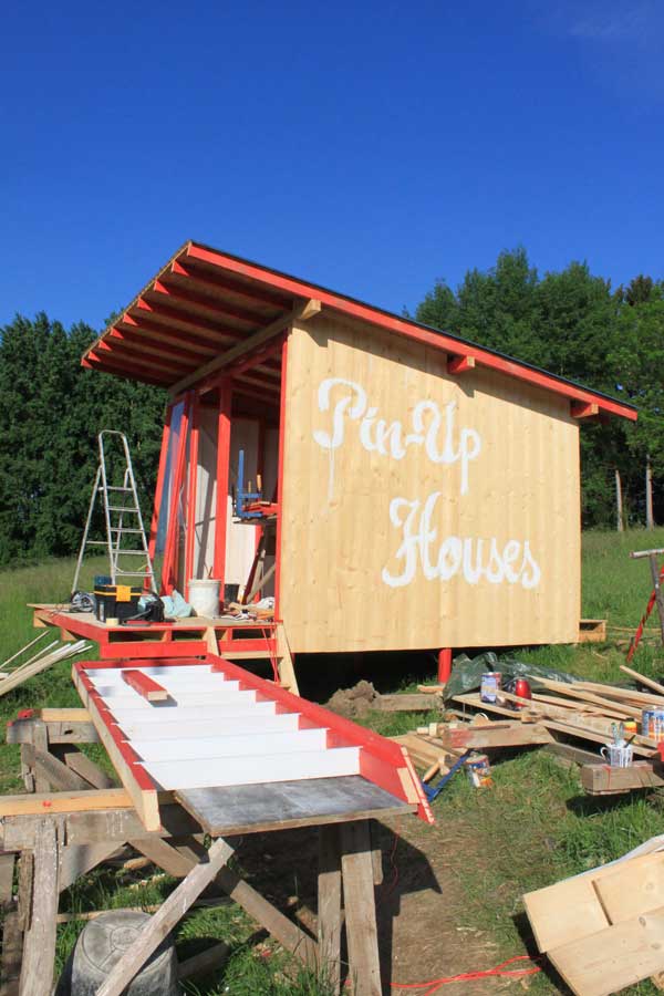 The DIY small cabin Cheryl with front porch is named after one of the most famous pin-up girls Cheryl Tiegs, and its construction plans are inspired by the design of a common beach house. You enter this micro house through little steps on the side of the front porch and get to the most unique and distinctive part of Cheryl’s design: a big, full-height sliding window covering the whole front wall. This provides a beautiful view from the cabin and enables direct access to the front porch, which can be a valuable feature during nice summer days. Inside, you can use the timber wall frames to put shelves or different kind of storage spaces in between and adaptable pieces of furniture, such as example upholstered cubes, which can serve as little seating in a social area during the day and put together as a bed in a sleeping room during the night.