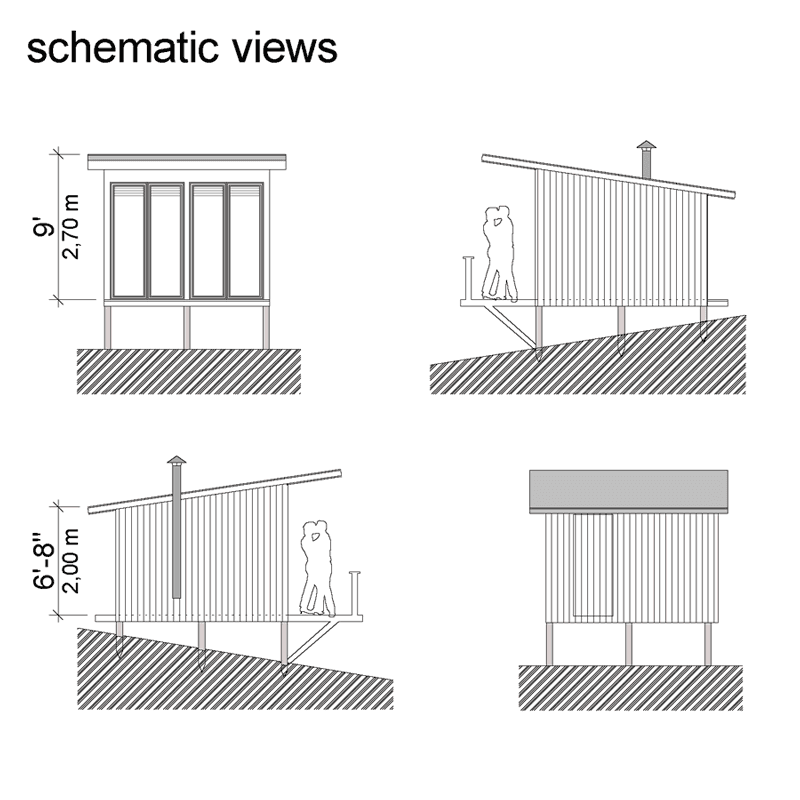 Complete set of beach cabin floor plans (pdf): layouts, details, sections, elevations, material variants, windows, doors