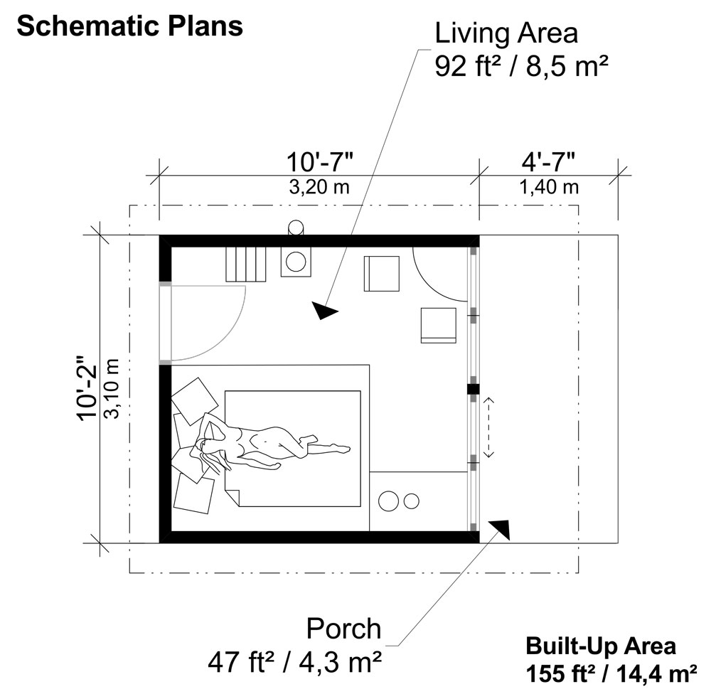 Cheryl is 153 sq. ft. (14,2 m2) small 1 room cabin with 46 sq. ft. (4,3 m2) porch. It is 11′-6″ x 11′-9″ (3,2 x 3,1 m)  one-room timber frame structure elevated on pillar foundation with shed roof and front porch of 5’-5’’x 11′-9″ (1,4 x 3,1 m) size.