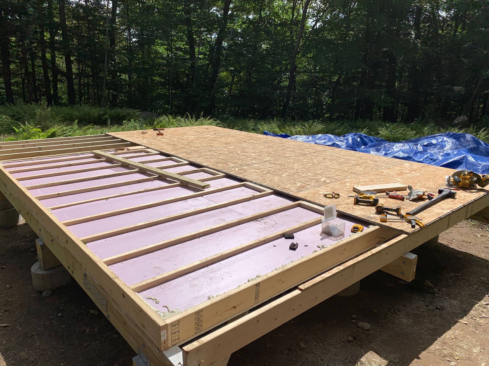 I put a layer of OSB Board painted with water-proofing on top of the bearers, then the 2X6 joists on top of that, sealed with 2X6s around the outside. I filled the joist grid with cut foam Board, sealing up cracks and spaces with spray foam, and then put another layer of waterproof painted OSB on top, and sealed everything with zip tape. This was probably all overkill, because very little heat is lost through the floor, but since it gets pretty cold where I’m building, I figured better to do too much than too little.
