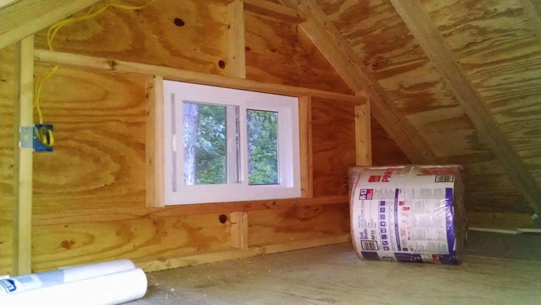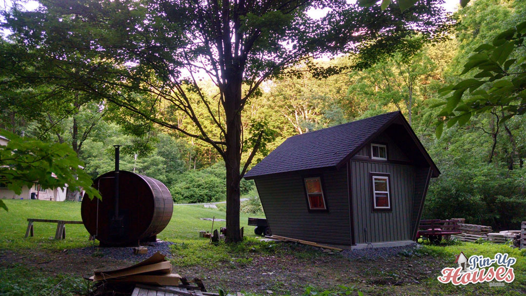 So far we have seen lot of the exterior and that is why today you can check out what the inside looks like! Let’s remind ourselves – there is a lumber framing, coated in plywood sheets and vinyl siding. The walls are sloped and each of them has a window. You can climb up to the loft and enjoy view from another two small windows and a skylight.