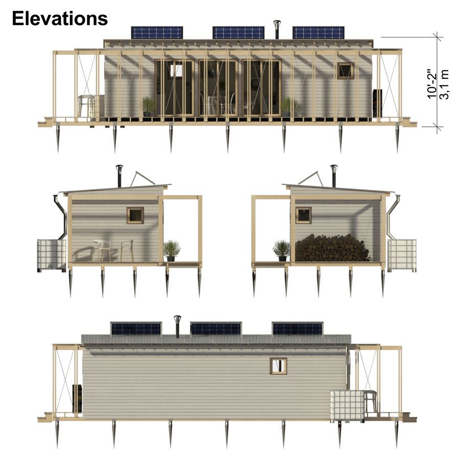 Complete set of cabin kit plans (pdf): layouts, details, sections, elevations, material variants, windows, doors.