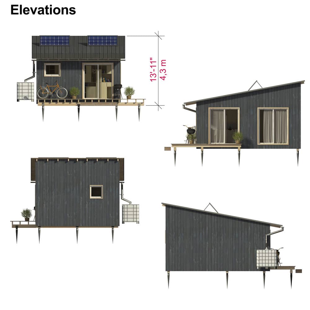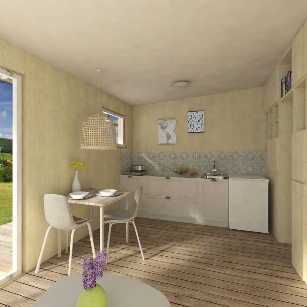 The Lara ground floor cottage has a pitched roof which is suitable for the placement of solar panels. The large windows bring plenty of light and sunlight into the cottage. The main room offers a relaxing and social area on the sofa, while the spacious kitchen invites you to prepare dinner and gather with family or friends. Through the annexe made up of storage spaces you enter the master bedroom with a double bed, from which you can admire your surroundings through the large French window. A second door in the storage partition leads to the bathroom, which counts with both shower and toilet, as well as washing machine and boiler. A part of the house is surrounded by an indispensable terrace, which serves not only for staying outdoors but also as a paved clean area to enter the cottage.