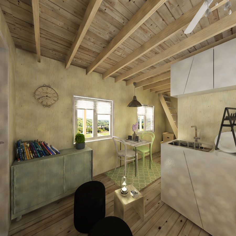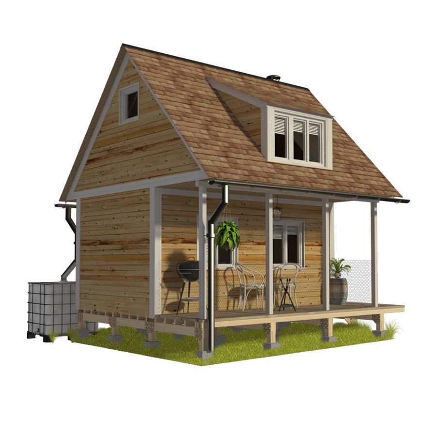 Cabin Plans with Loft Bedroom Mia is another member of our tiny house with a loft with and gable roof, two rooms, and a bathroom. The loft has an extra space added by a dormer to provide more room for additional storage or provide more spaciousness. The downstairs area divides the space between the porch, the main room with the kitchen, and the bathroom. The roof sheds the porch. Optionally, the porch can be turned into a winter garden or an extra room by adding an extra wall. Cabin Plans’ design with Loft Mia combines elements of traditional architecture like in our other cabins with loft, such as Lynda; with modern-style tiny houses with dormers, which you can find among our other tiny house plans with loft, such as Judy. Furthermore, with our life hacks, you can save up space and add energy or water-saving elements, like a water tank or sun collectors and save up a little on the costs. (Find out more at our Small house blog) Cabin Plans with Loft Bedroom Mia is a low-cost DIY tiny house plan designed for individuals, couples, or small families who like alternative living solutions with low-cost living. You can also equip your house with other useful hacks about which you can read more in our best-seller, the book HOW TO BUILD A TINY HOUSE.
