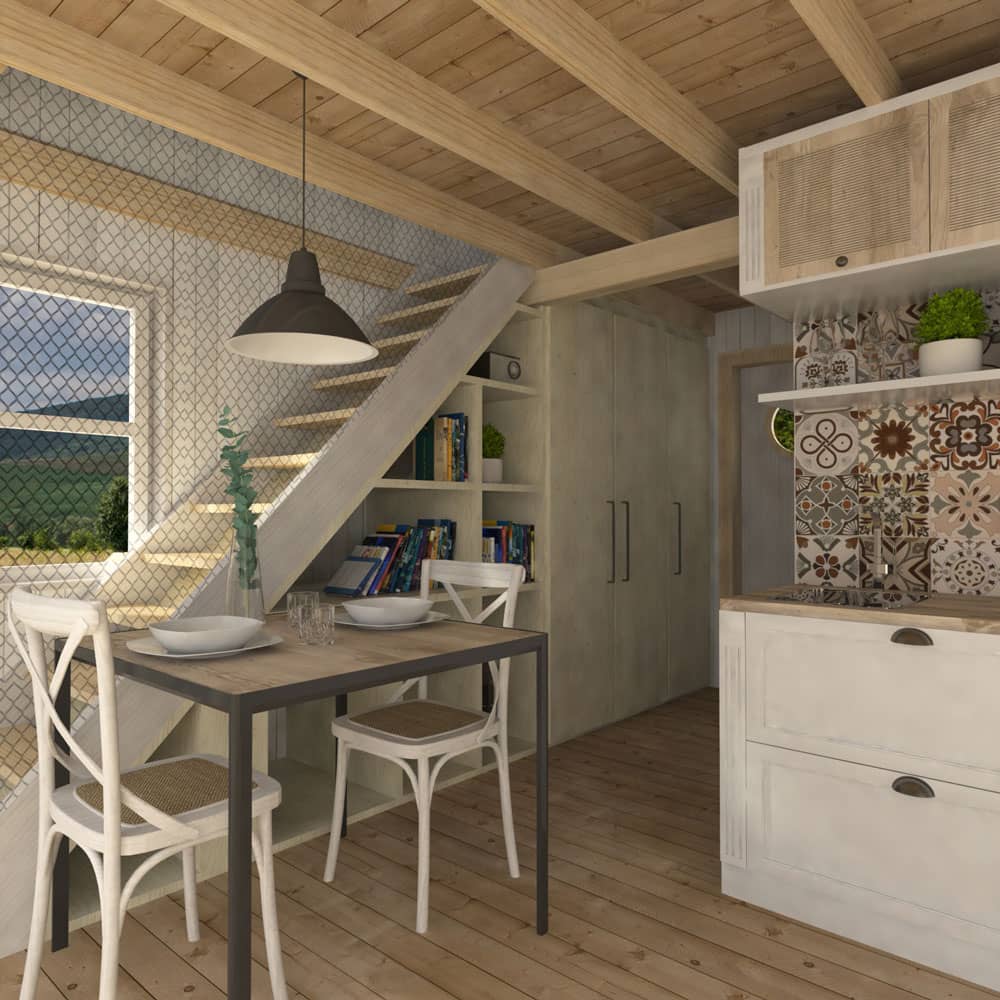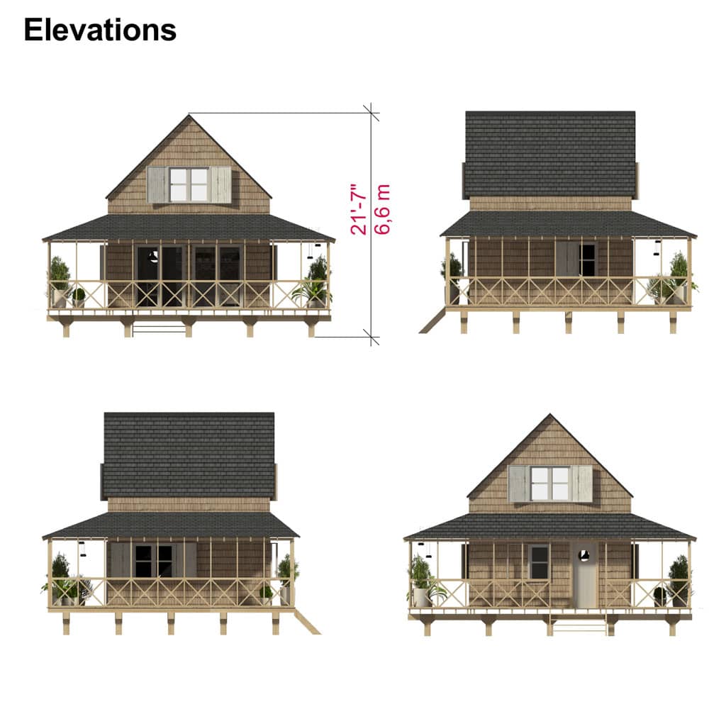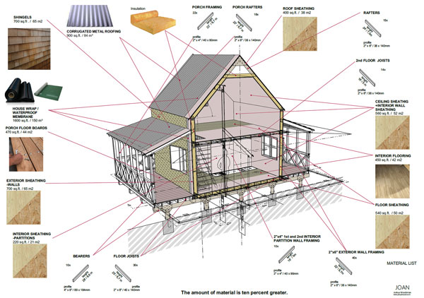 Complete set of Cabin Plans with porch (pdf): layouts, details, sections, elevations, material variants, windows, doors.
