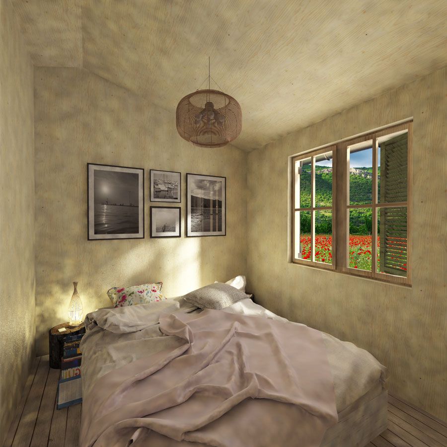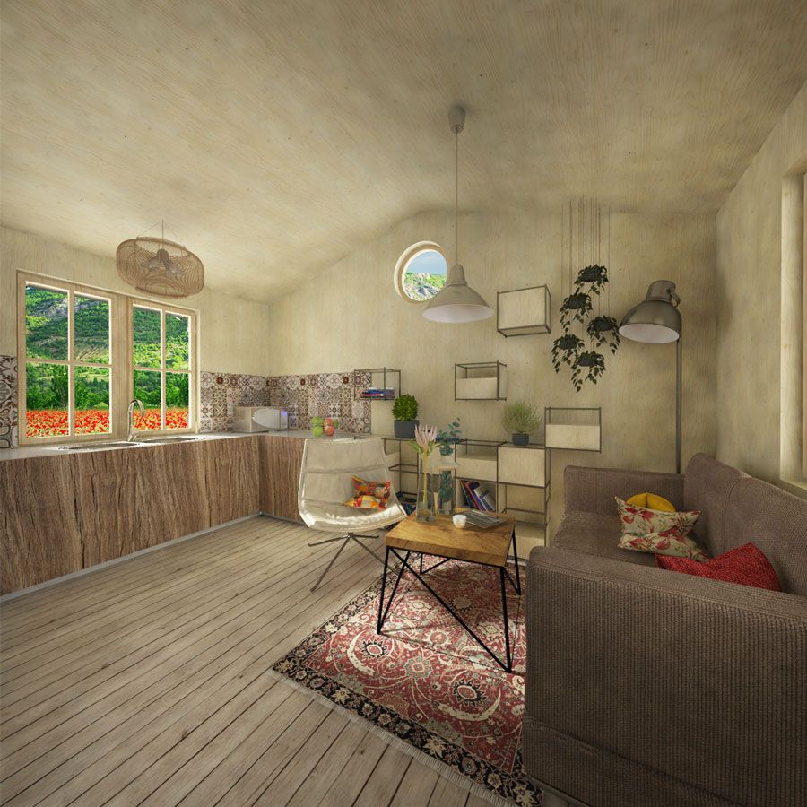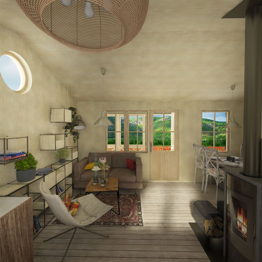Welcome to Isla plans, the amazing two-bedroom cabin. Besides being a popular size, Isla has a special feature – the screened porch that gives it a proper ranch feeling. As visible on the plans given, the Isla cabin is to be entered through this porch (originally 4,3 m² / 46 sq. ft, which could be adjusted). The main room combines both the living area and kitchen, leading the way to the rooms. The whole construction is easy to build, and you also get a lot of instructions and help from the Pin-Up Houses team. So what are you waiting for?