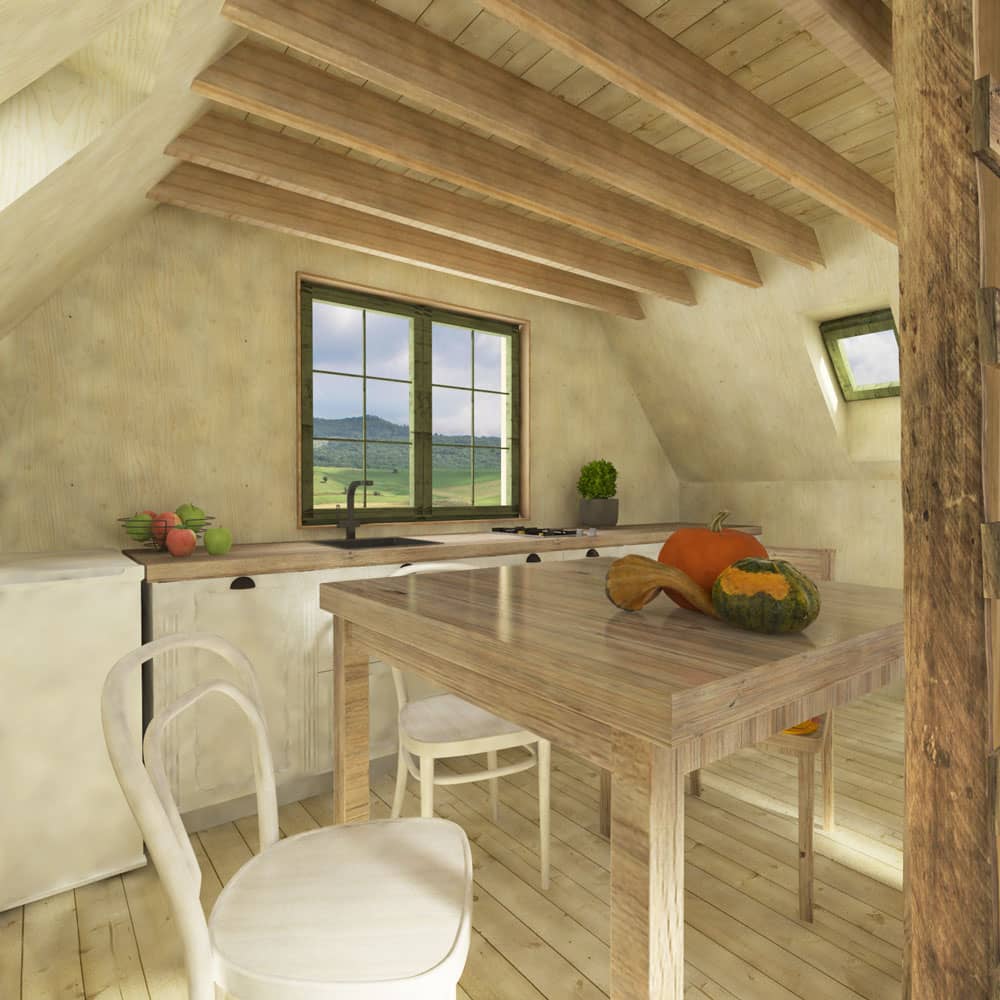 The Lynn cabin has a classic tent shape with a base, which is often found in campsites. Its simple and functional layout makes it suitable not only for camping but also as a weekend cabin. There is plenty of space on the ground floor for a large kitchen and dining table. The main living room looks very airy thanks to the open space up to the rafters. Above the kitchen area, space has been created for a sleeping floor. The beautiful space in no way detracted from the freedom of space inside the cottage and also offered a separate area for quiet relaxation. If you like to watch the chirp of the campsite, a small entrance terrace has been designed in front of the cabin, an ideal observation point.
