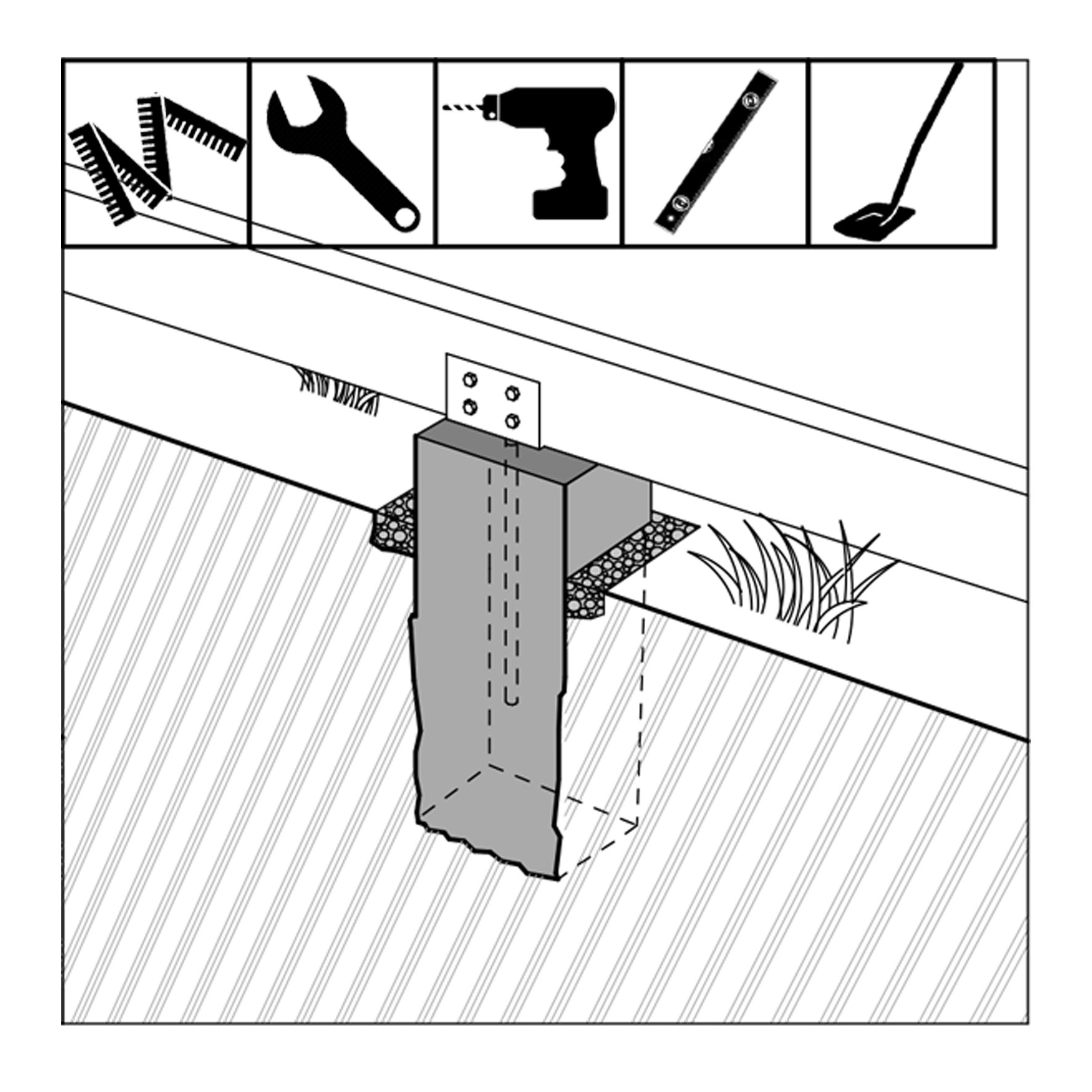 After reassuring that the formwork is prepared firmly in its place, pour concrete in and install the anchor bolt inside. It acts as a rebar in reinforced concrete – helping to reinforce the resistance of in situ concrete against tension, while the material itself has an amazing strength when under compression. Fix also the metal fasteners. After the concrete cures properly, it is ready for the floor joists to be installed. It is also possible to add gravel as an aesthetic finish to the surroundings of the foundation.