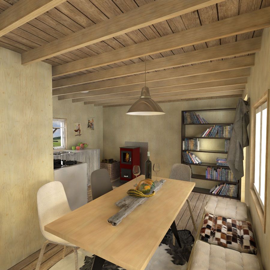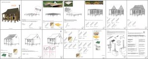 Complete set of Cabin Plans with Loft Bedroom (pdf): layouts, details, sections, elevations, material variants, windows, doors.