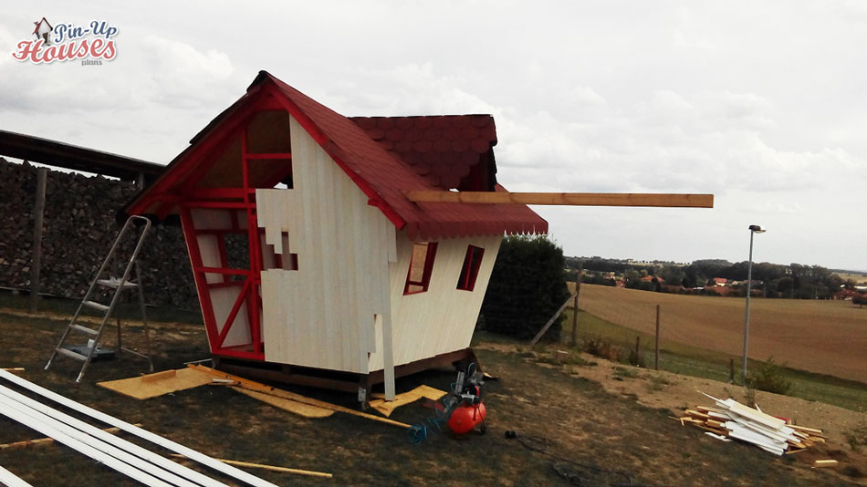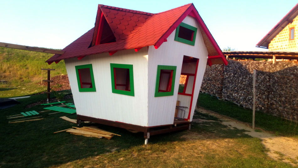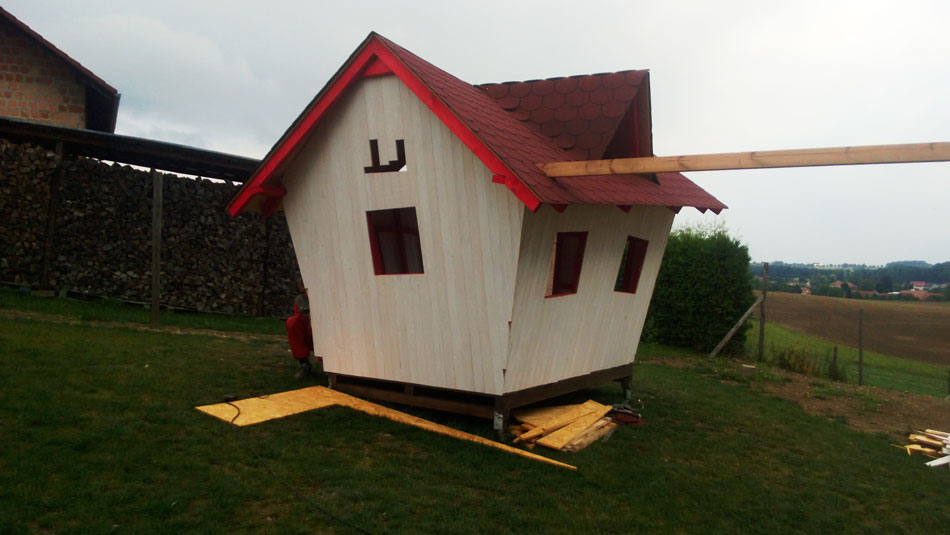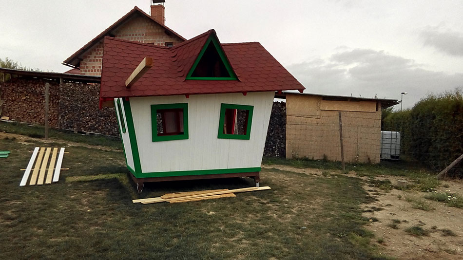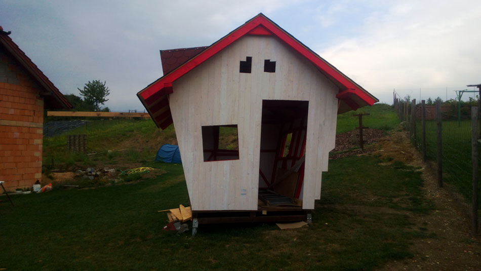 Remember our excited article about crooked playhouse in Czech Republic? The small house made of red timber frame, which has a loft and cross gable roof with with little windows? This one. Well we are back reporting the completion of the construction process!