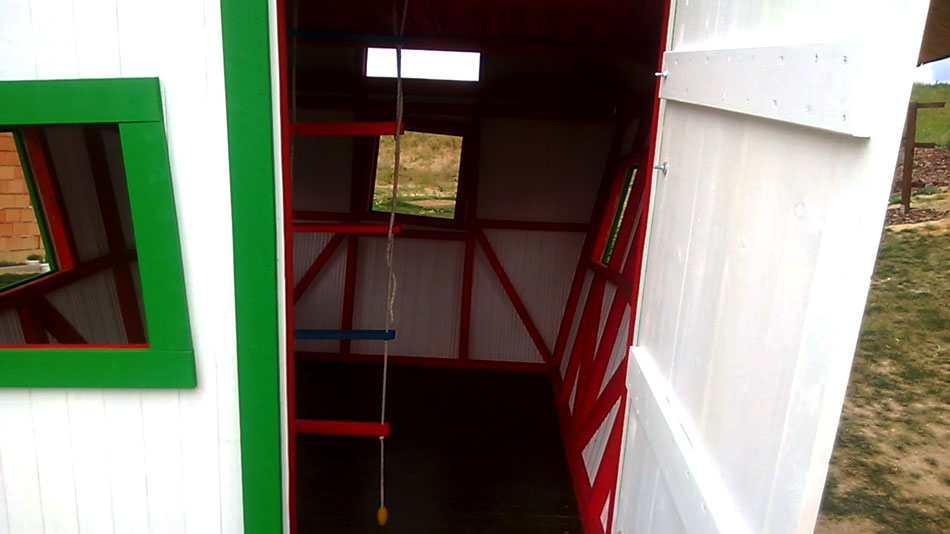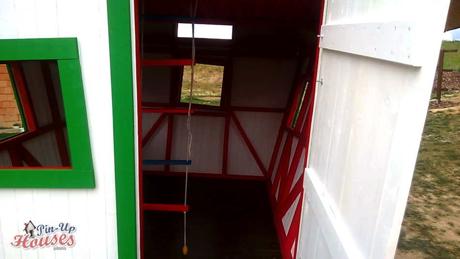 Well look what we have got here on another picture, oh lala, the whole kids playhouse finished and gorgeous! Walls have been painted white, which creates very nice contrast with green window frames. The door is simple hinged white door and there are two tilted framed window openings on each side, all of which are left open without glass or anything else put in – apart from the gable end windows that have safety nets installed. Why not, outdoor playhouse during big part of year does not need to be fully closed and this maybe makes it look even more elegant, we think.