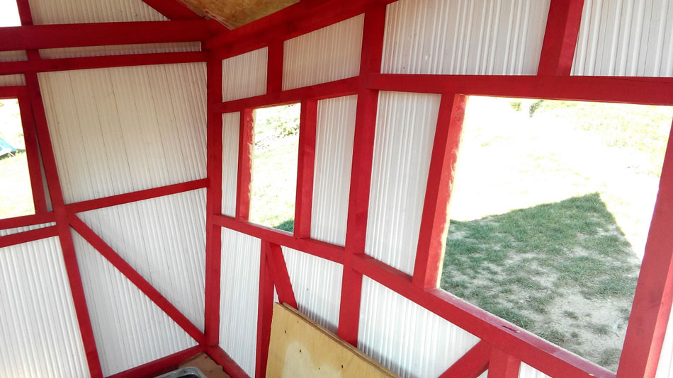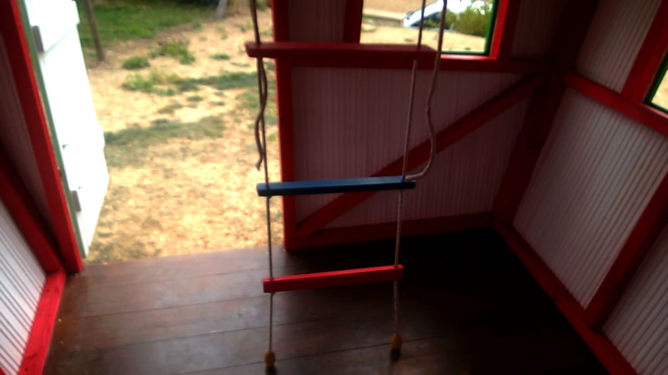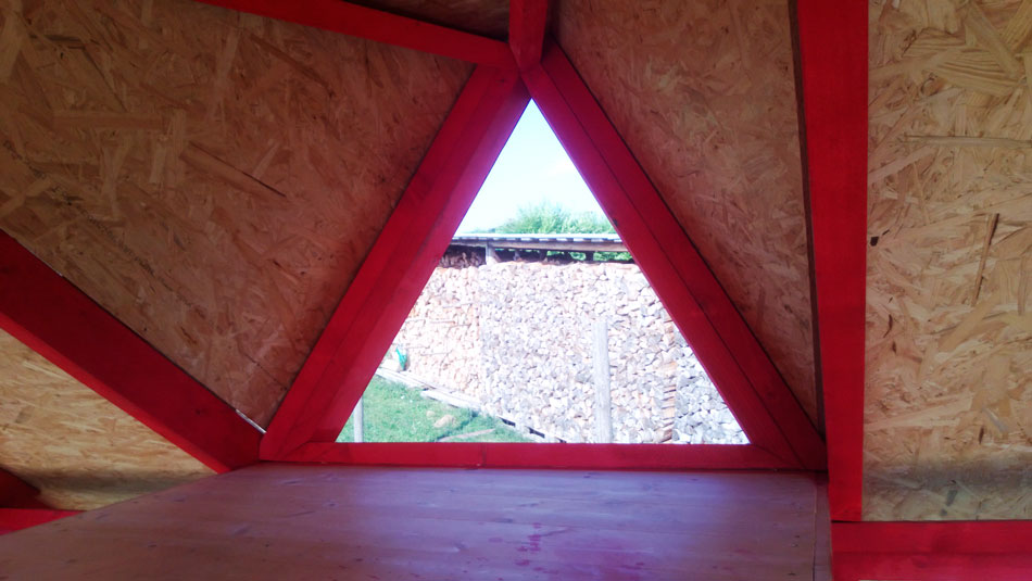 So what do we have inside? Let’s have a look. We have again very visually pleasing space. The irregular red construction frame against white walls with some very nicely done finish simply works great together. Rope-ladder will take us to the loft we are all so curious about! Wooden floor is red, two main gable ends white just as “downstairs” plus we also see the OSB boards used for roof and two gable windows. Talking about the gable roof, we like its shape very much and what kind of intriguing space it creates!