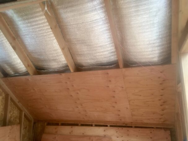 Fortunately it’s warm more or less all year around here and the shed doesn’t need to be heated. I had a different problem: the metal roof gets super hot during the daytime. First, I laid a reflective foam between the rafters and purlins; it helped a bit but still was hot anyway; so I added fiberglass batts between the rafters and enclosed all of it with ½ inch plywood ceiling.