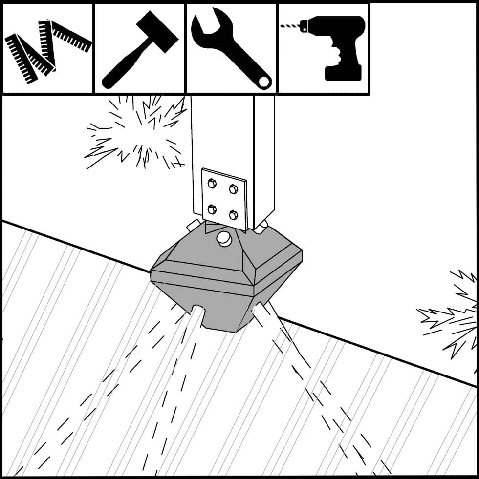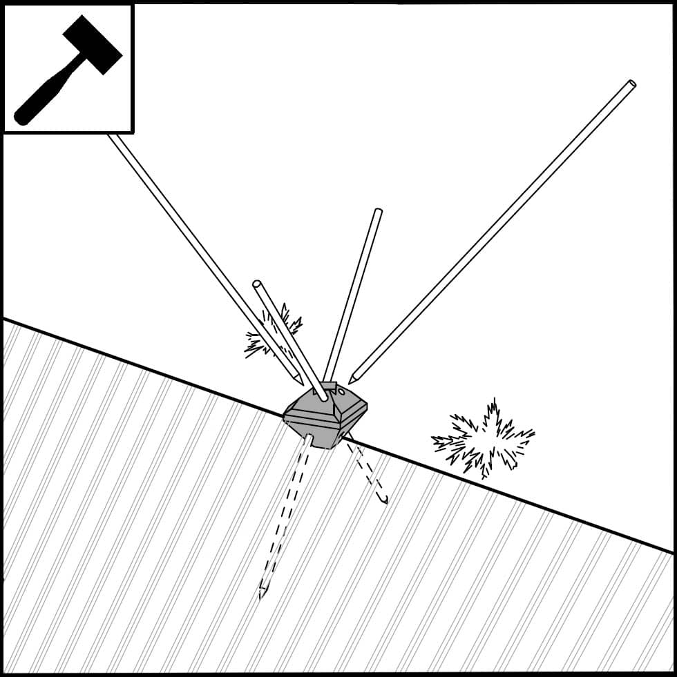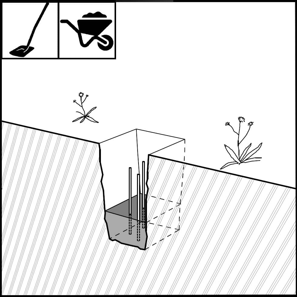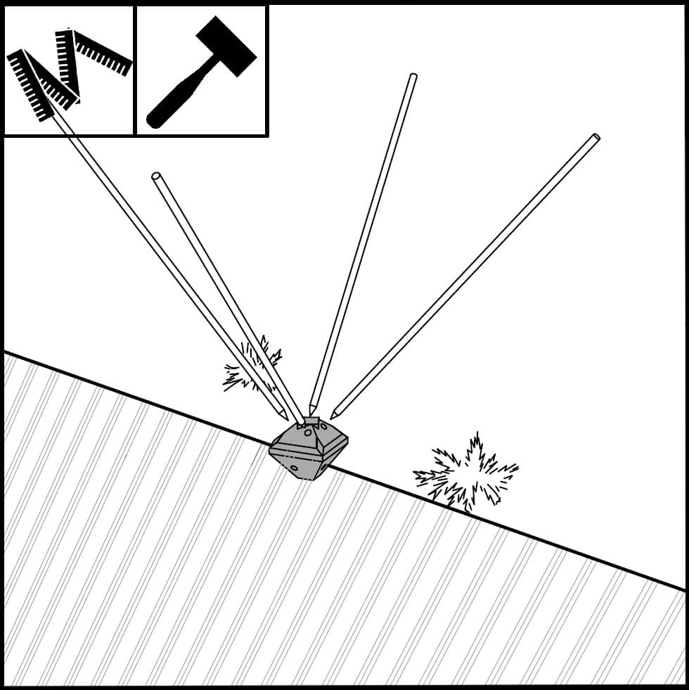The diamond pier is a very effective type of foundation, whose individual spines reach deep below the surface of the earth. Due to its high stiffness, it is particularly suitable in areas with unstable foundation conditions, such as sandy subsoil, silty soil, or waterlogged soil. The installation can be carried out without laborious digging and pouring of concrete. The prefabricated foundation head is positioned above the ground surface and holes are punched through it with steel rods that are hammered in with simple hand tools. Suitable joinery fittings can be connected to the foundation head so positioned.
