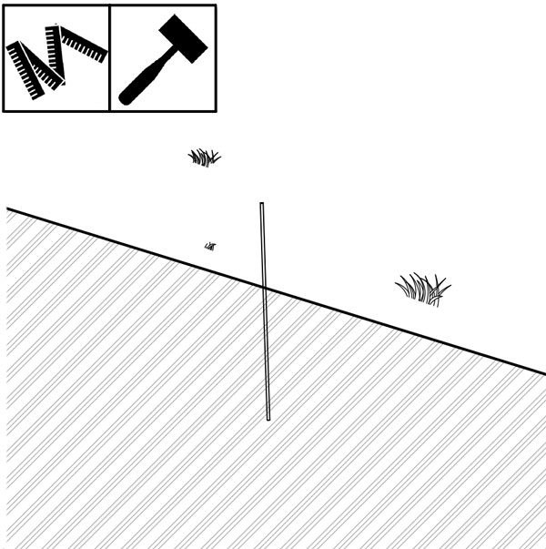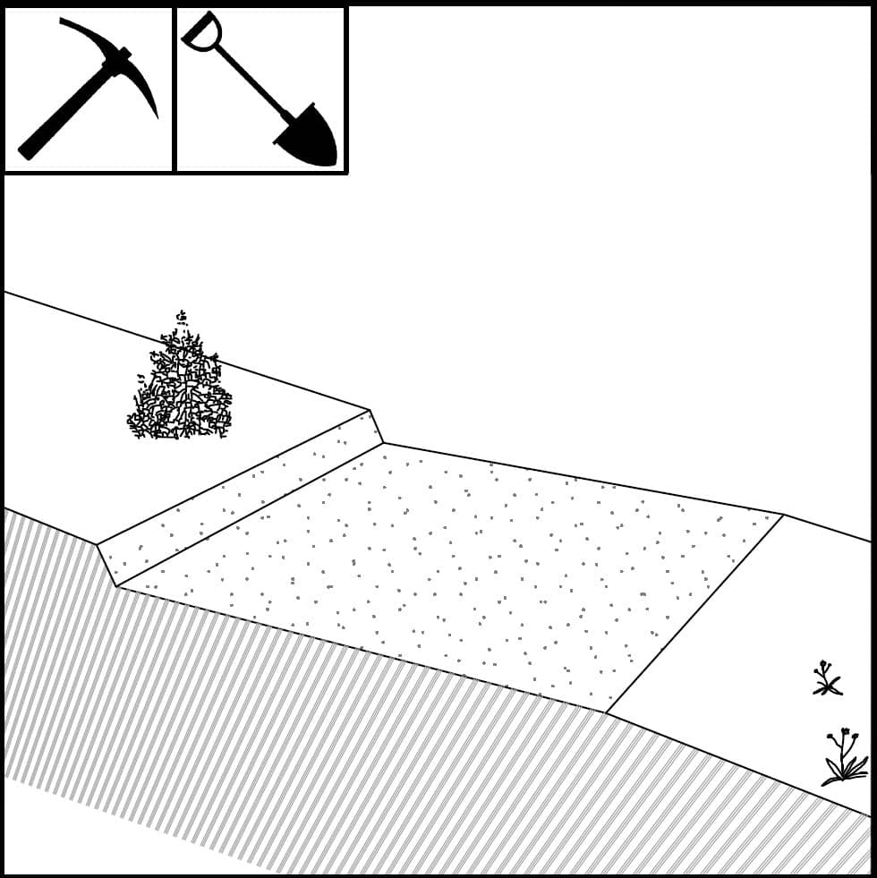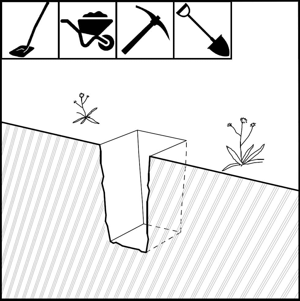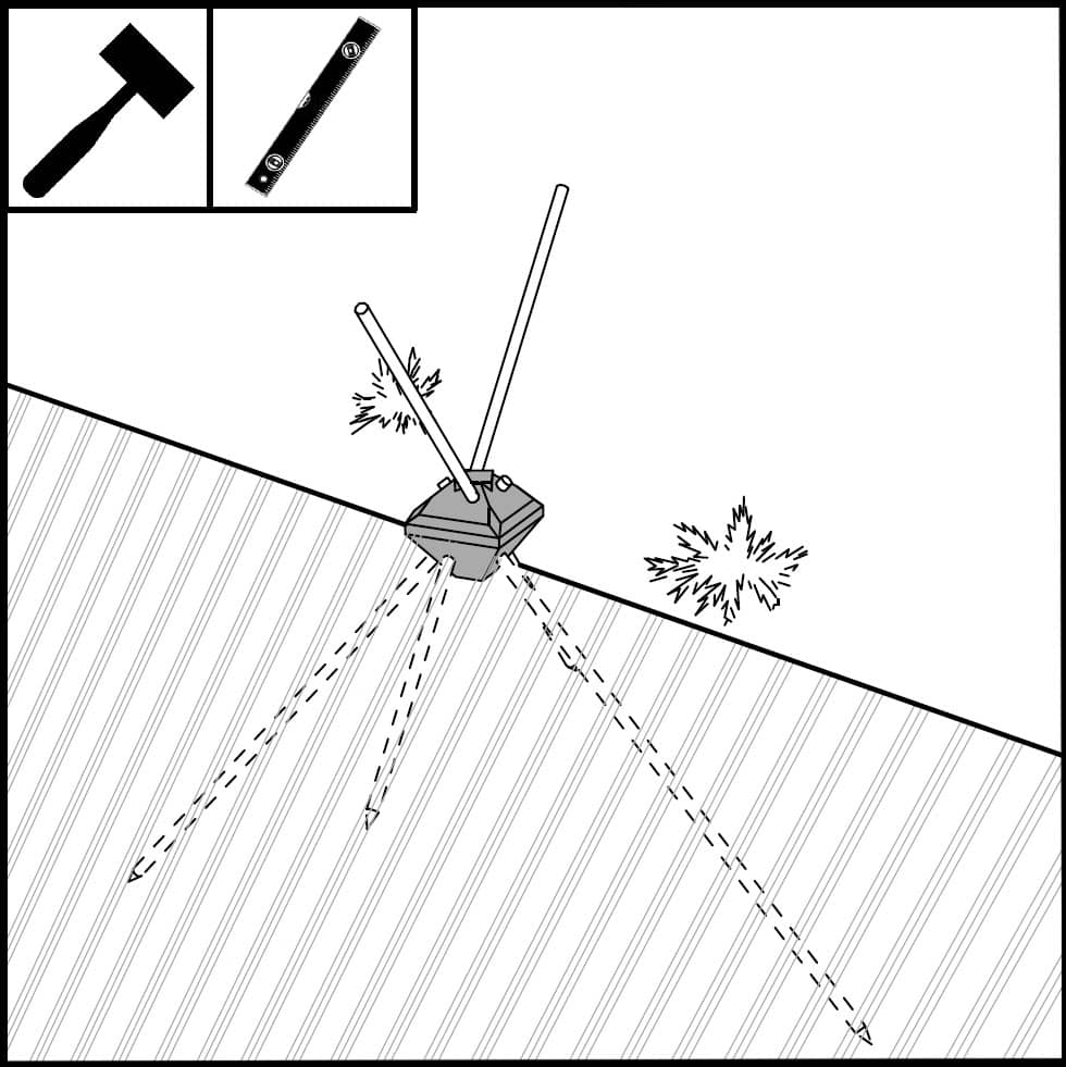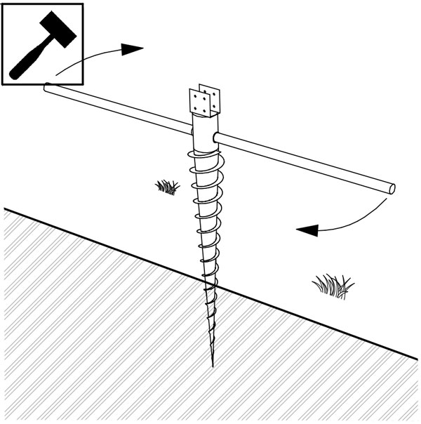 The diamond pier is a very effective type of foundation, whose individual spines reach deep below the surface of the earth. Due to its high stiffness, it is particularly suitable in areas with unstable foundation conditions, such as sandy subsoil, silty soil, or waterlogged soil. The installation can be carried out without laborious digging and pouring of concrete. The prefabricated foundation head is positioned above the ground surface and holes are punched through it with steel rods that are hammered in with simple hand tools. Suitable joinery fittings can be connected to the foundation head so positioned.