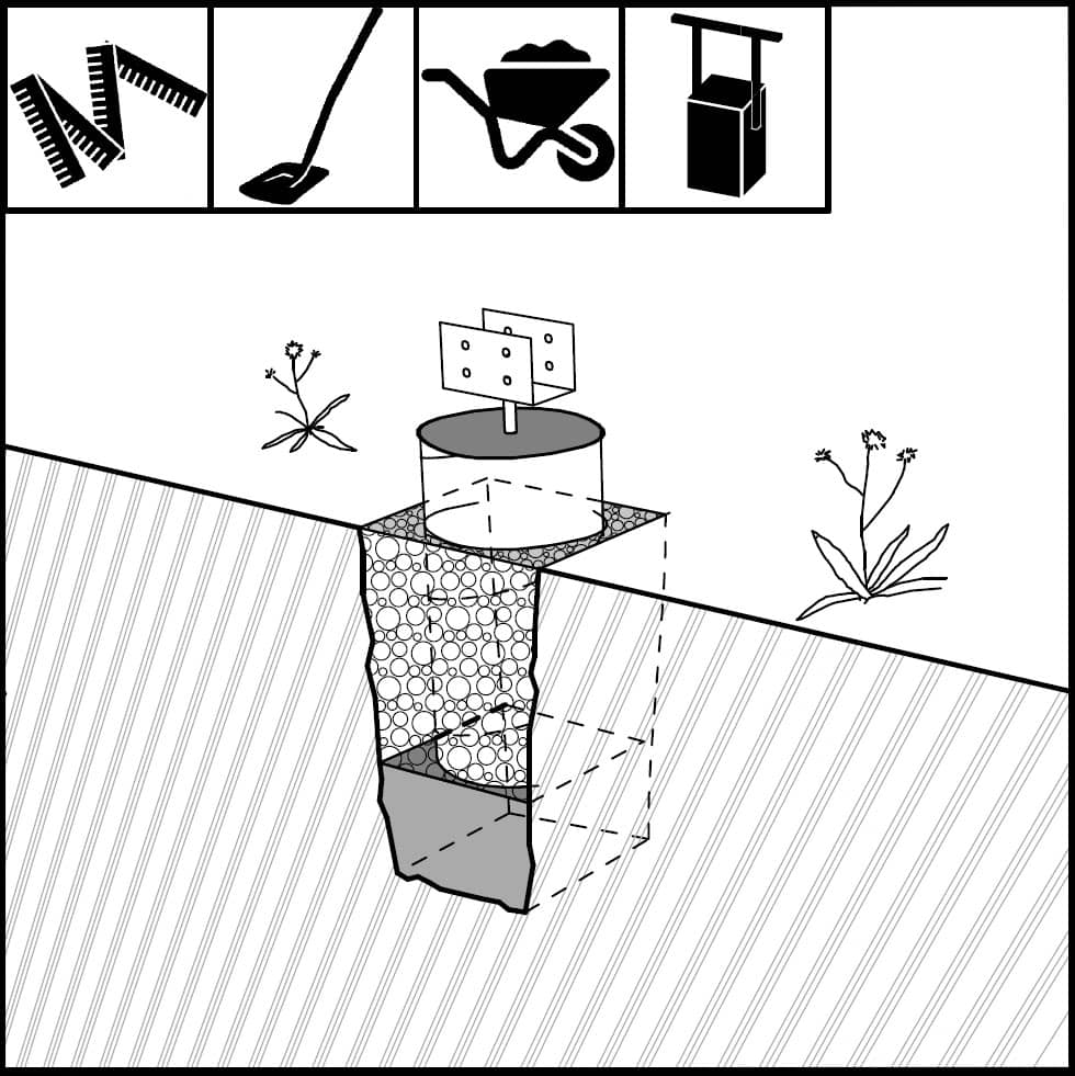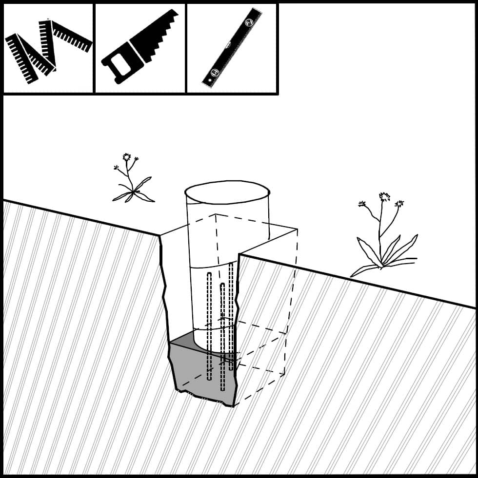 This foundation is similar to other concrete foundations. It is simpler in that it uses lost formwork made of paper or plastic. Concrete is poured into the buried form to create the foundation. We already leave such a mould in the foundation. You can buy specialised foundation moulds made of hard paper or you can use, for example, a thick drainpipe. We can also use reinforcement to strengthen the whole structure as shown in the picture. Fill the concrete foundation below ground level with gravel and compact it thoroughly.