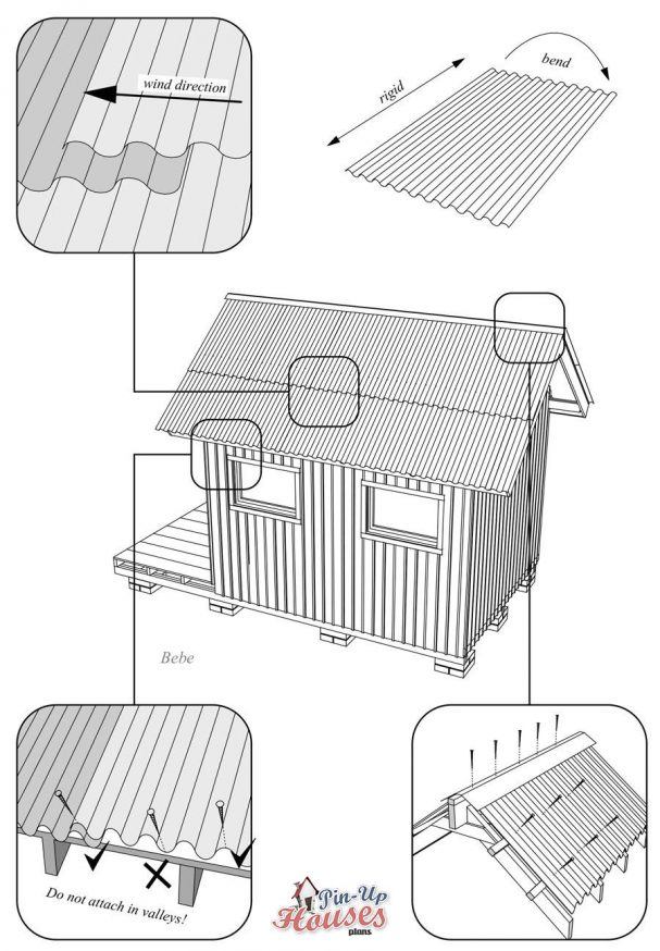 Also, make sure that when you attach the roof to the wooden supporting structure, you do that only on proper places. Ideally, the metal plating should be joined together and fixed with screws only on spots where it is supported by the wooden structure, as illustrated in the picture above.
