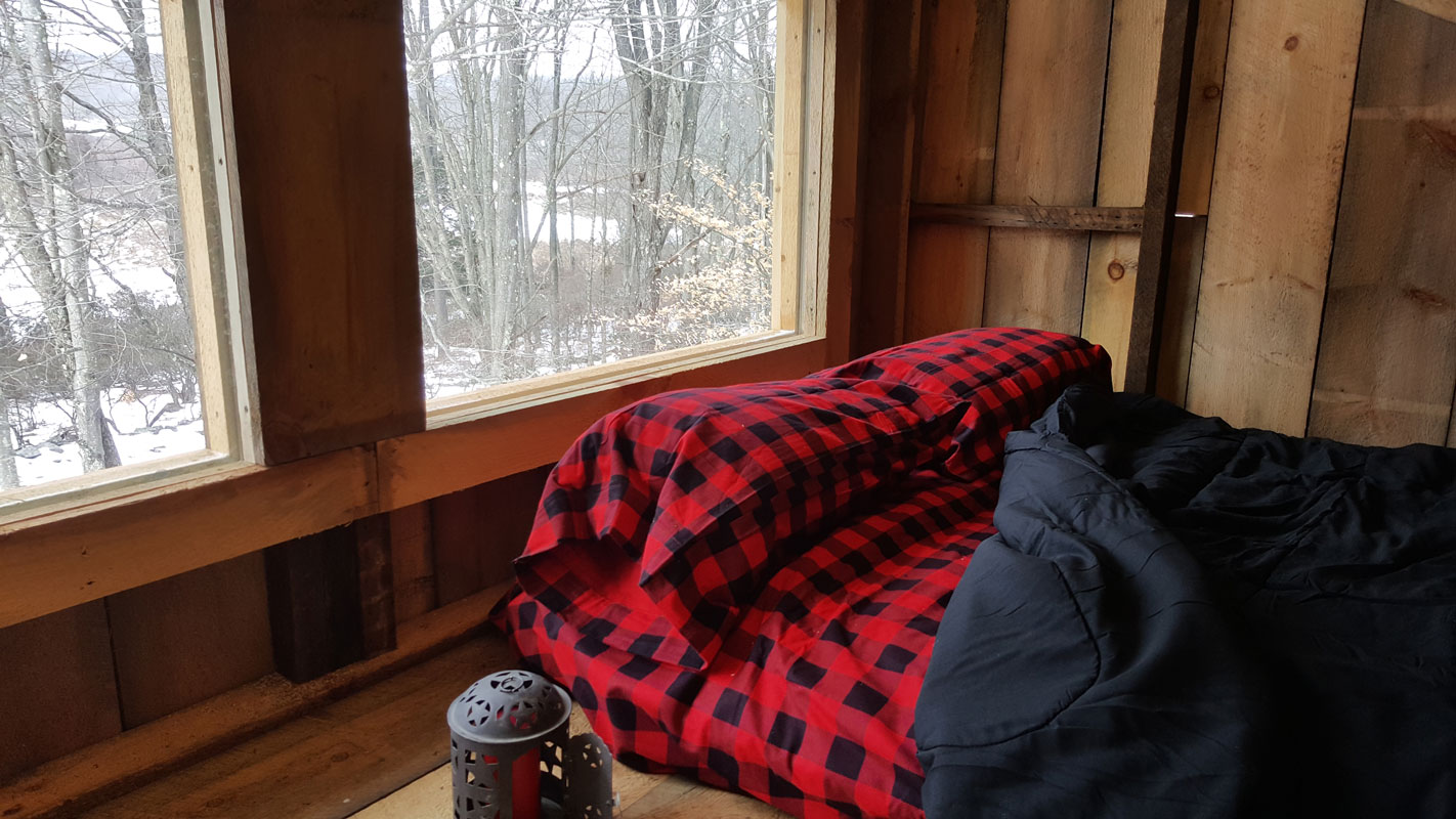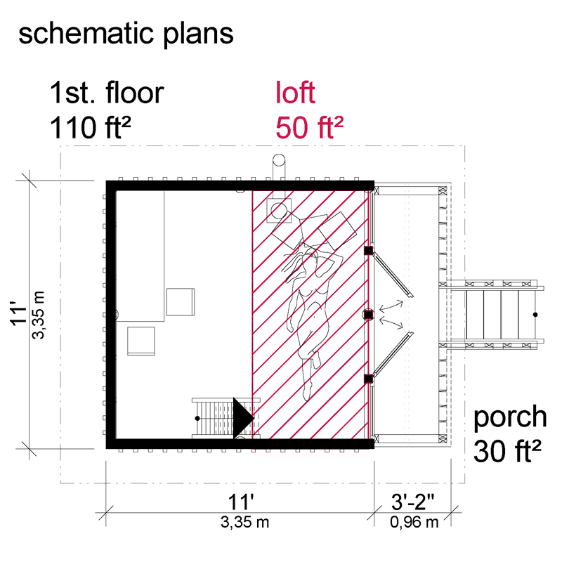 Virginia is 202 sq. ft. (19 m2) 1 bedroom small cabin with 30,8 sq. ft. (2,9 m2) porch and 50 sq. ft. (4,6 m2) loft. It is 11′ x 11′ (3,4 x 3,4 m) one-room timber structure standing on posts, with sloped roof and with front porch of 3′-2″ x 11′  (0,85 x 3,4 m) and loft of 5′-6” x 11′ (1,35 x 3,4 m) size.