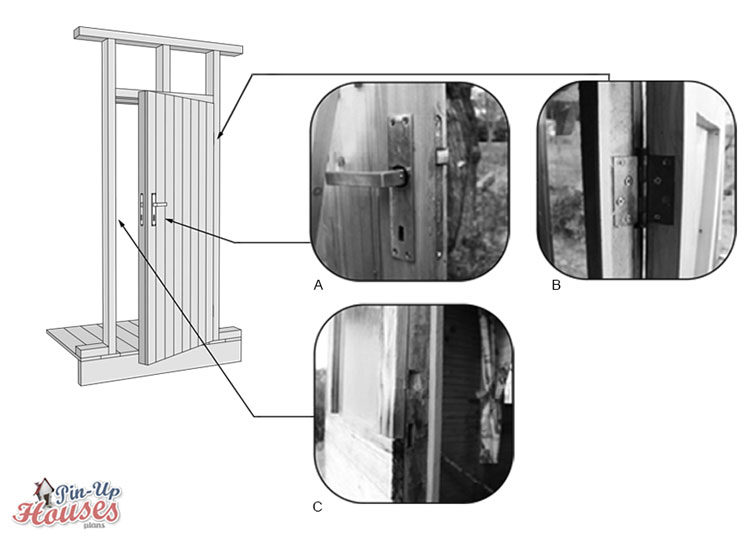 The door handle with the lock system is attached to one of the door stiles, on the swinging side, while door hinges are installed at the other, the fixed hanging side. They serve to connect the doors to the linings in a wall frame and enable it to swing open. When closed, the door rests against a door sill, the bottom horizontal part of the door frame, which sits directly on the floor framing. On top of it, a door threshold is installed, usually, a slightly sloped raised piece, which covers the bottom part of the door opening, stopping the water and dirt from outside. It can have integrated a weather-stripping providing insulation. For the simple DIY entrance door on a small house, you can do without a sill and threshold with the doors standing directly on top of the floor or flooring surface. However, they help protect your house from weather and provide a visual boundary between your home and the outer world.