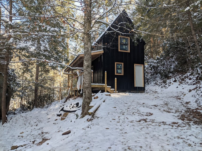 Finished tiny cabin built off-grid in a remote rural area with surrounding hills