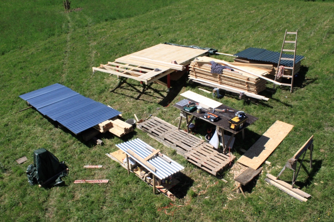 We chose our small wood cabin Cheryl for the free cabin plans, because it is a lovely one, but also because we built it ourselves as well, so you can see and compare the plans and the results. Cheryl is a small, one room cabin with great front porch. It stands elevated on timber pillars and little stairs on the side lead to the fenced and partly covered front porch. Full height sliding doors cover nearly whole front façade and provide direct access from the porch to the interior space as well as enough daylight and nice views from the inside. There you will find one room with little kitchenette and shed roof.