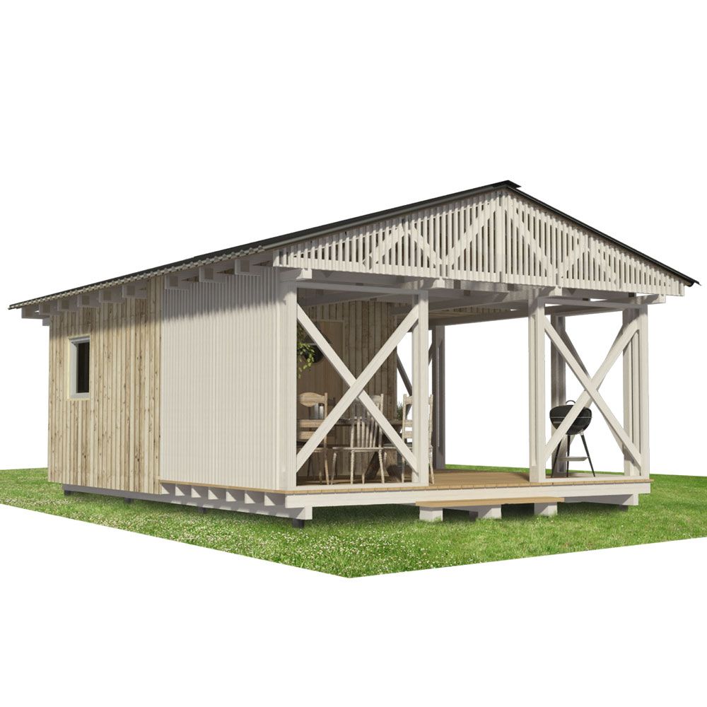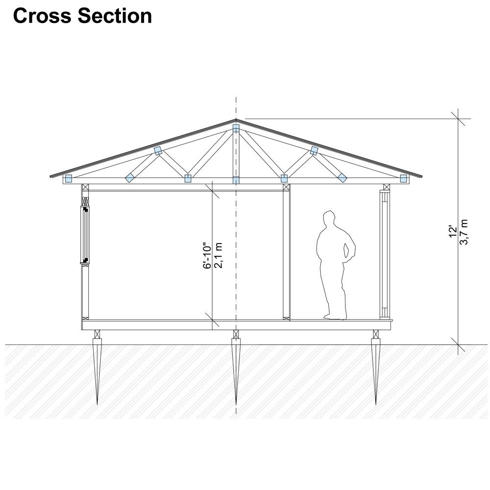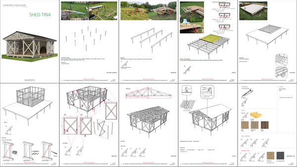 Complete set of shed plans (pdf): layouts, details, sections, elevations, material variants, windows, doors.