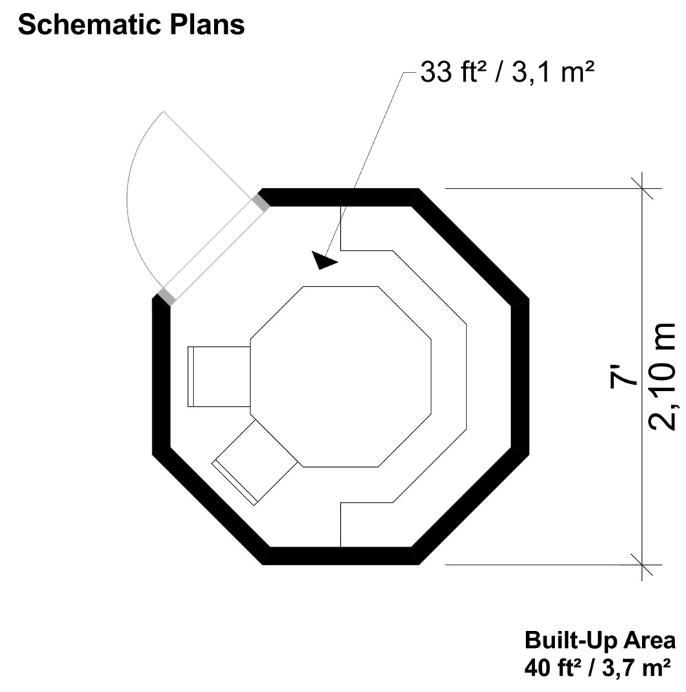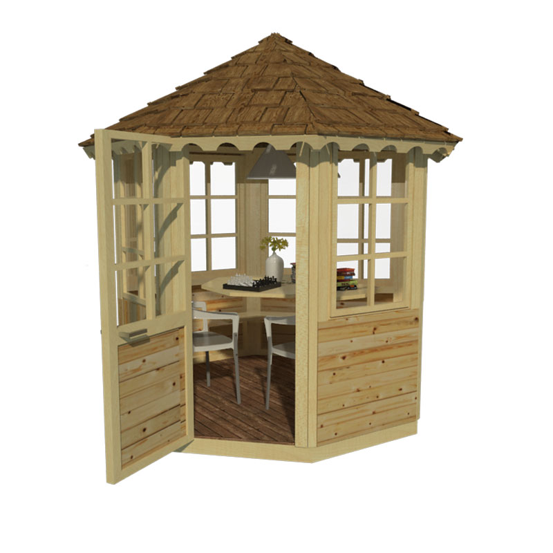 Easy to build gazebo Clara is a lovely small wooden shed. It has a simple yet effective symmetrical hexagonal design and would be a great addition to your garden or vacation. The interior space with a table, bench, and a room for more seats creates good conditions for all sorts of purposes. You can enjoy your afternoon coffee or evening glass of wine; you can have a private reading room or a study there, you can relax, turn it into a creative workshop space or a play area, and really use it for anything you wish. It is enclosed, so bad weather does not need to bother you at all, but it has a window coming to the very top on each of the eight walls, so you can still benefit from proper daylight and enjoy views around.