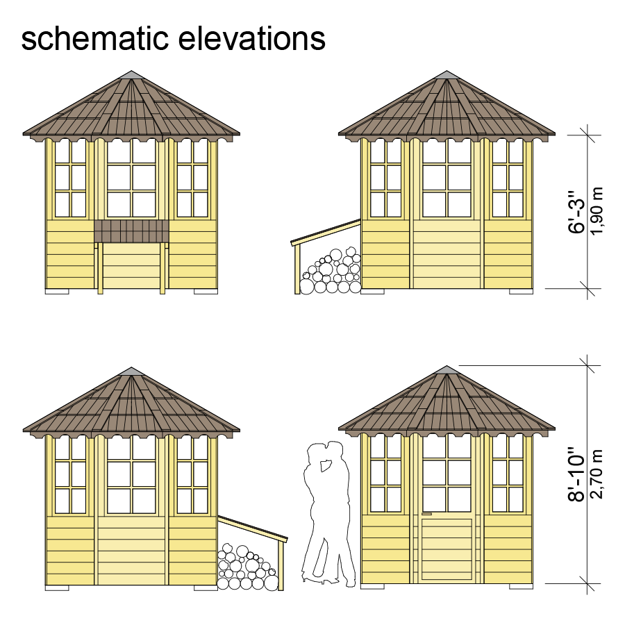 Complete set of gazebo plans (pdf): layouts, details, sections, elevations, material variants, windows, doors