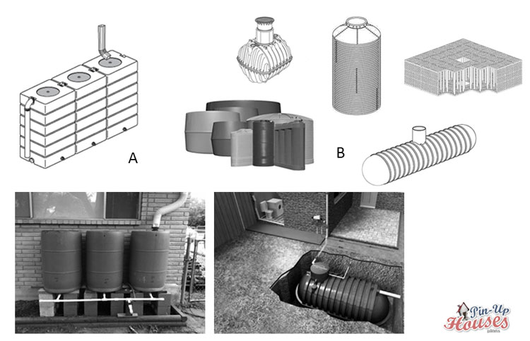 A variety of systems for rain-water harvesting, from small and very easy to install to more developed, automates ones, which require a professional setup. There are two most common types regarding the storage water facilities, at least in case of the simple systems possibly suitable for your tiny houses or small cabins: freestanding and underground water tanks. Freestanding water tanks are affordable, easy to manipulate, and do not require any groundwork. But there is a risk of sensitivity towards weather conditions – they may need to be emptied during winter and can heat up and accelerate the water biodegrading during summer. Due to constant exposure to the outdoor environment, their life span is shorter, not very visually pleasing. Most of this can be prevented with the right choice of materials and insulation, but that will, on the other hand, make them more costly.