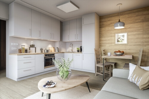Modern studio apartments have a kitchen right next to the living room area. You can apply the same logic to your tiny house to maximize space.