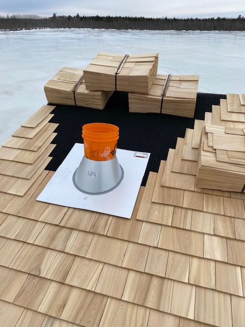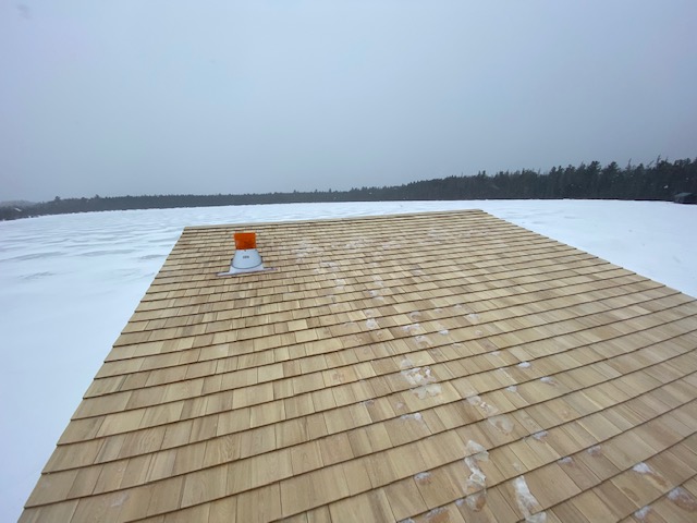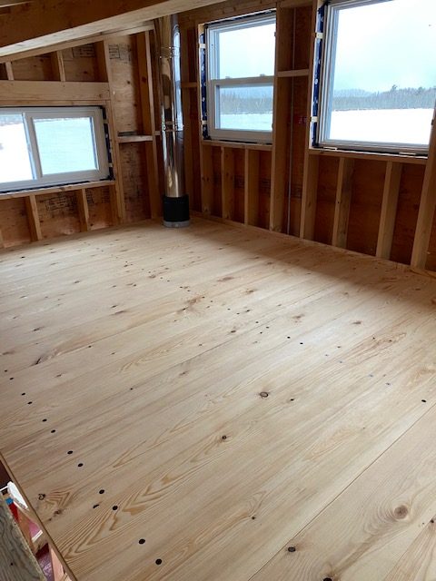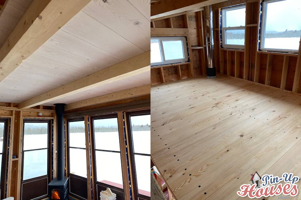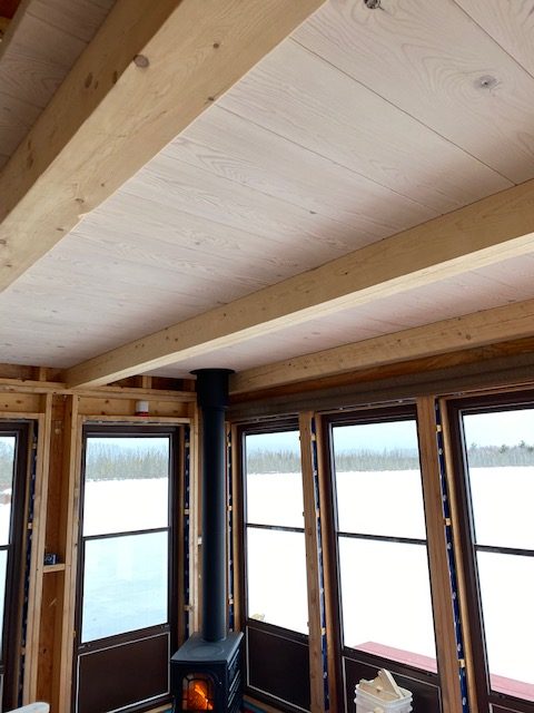 Since our last mails i’ve completed a cedar shingle roof, installed a nice wood stove and the loft floor / ceiling crafted out of recycled hemlock beams. The ceiling ( under) is whitewashed with diluted white latex and the loft floor is polished &oiled. I am currently working on pine, board and batten siding.