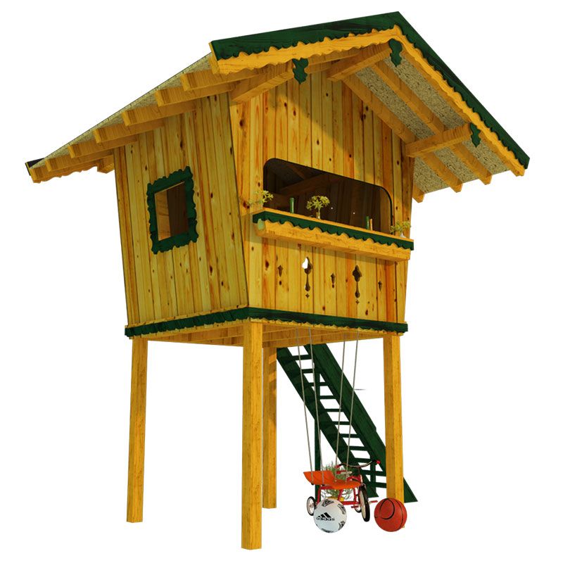 Our kid’s playhouse blueprints are one of the popular categories, lookout playhouse among them. This charming wooden lookout playhouse for children, elevated with a pitched roof, will definitely become a loved place for your kids! They can climb through the mildly steep wooden staircase and enjoy their space on top of everything. Two opposite walls in the playhouse room are tilted slightly towards the outside to create a more spacious interior, so your kids and their friends can all play in comfortably. There is one wide window opening in front and another on the side, providing them with a great view over everything going on around. The overhanging pitched roof and usage of timber create a look of a lovely little wooden house.