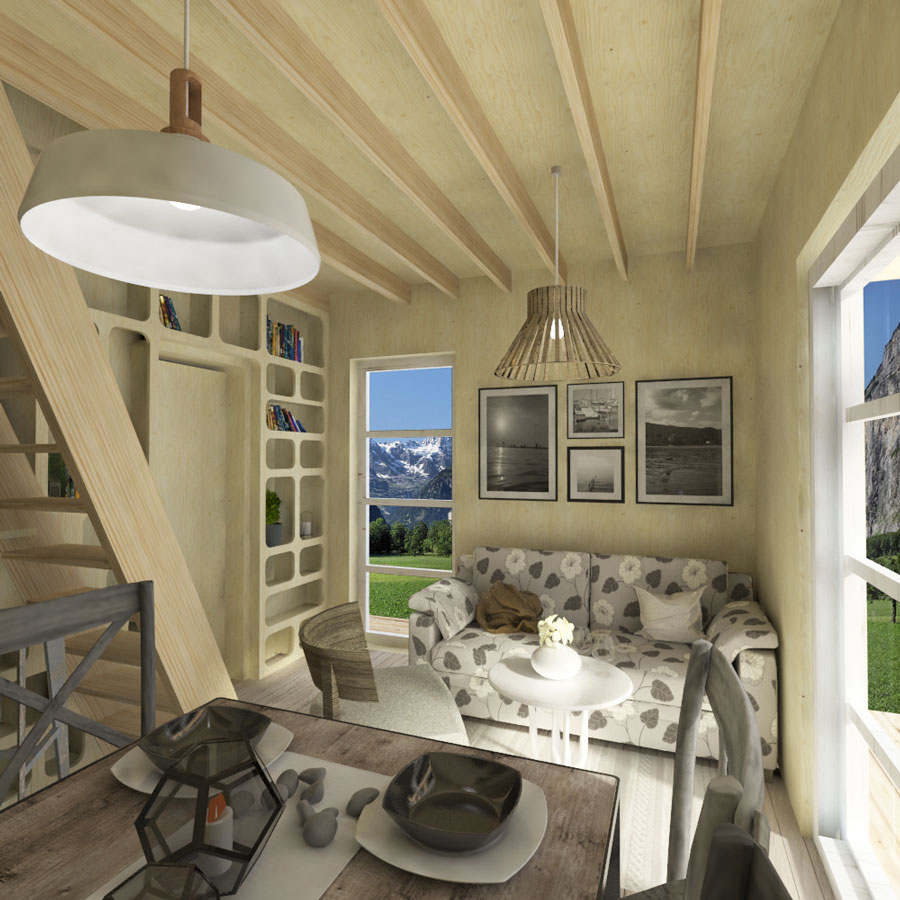 Nancy is a very likable option of mini house plans for families, having two bedrooms. While it does not look brutally spacious, we are building tiny houses; after all, it has everything you would expect from a decent house. The downstairs program is carefully separated from the upstairs, which is dedicated just to bedrooms. As visible on the plans, we have chosen a bunk bed for one of the bedrooms, but don’t hesitate to optimize it according to your needs. Also, regarding eco-friendliness, you’re free to go on top of it. We share some useful tips on the blog that you could implement when building your own tiny house.