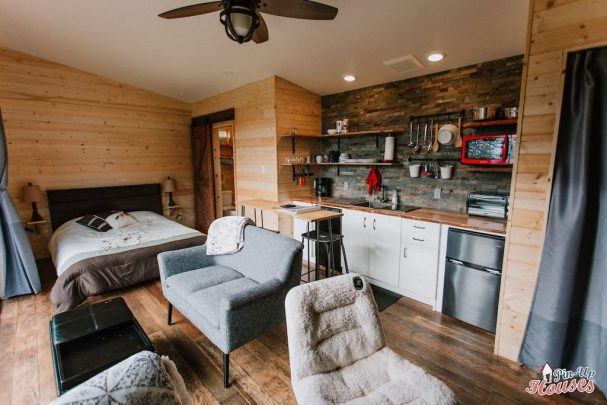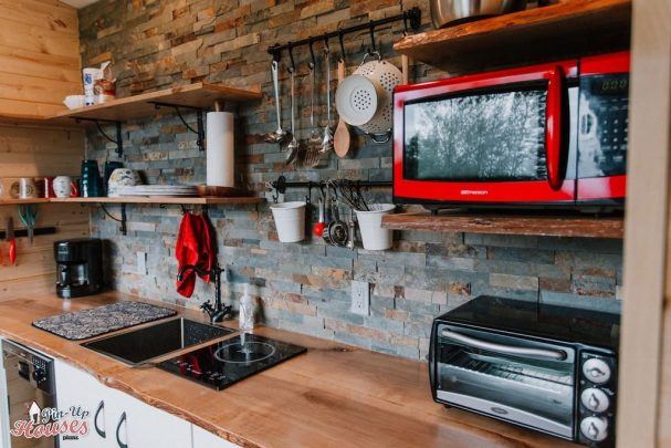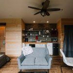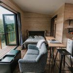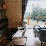 The house actually forms the main living area with a kitchenette and a king size bed, a bathroom with a toilet and a small storage area to the right of the entrance. Ground plan is based on Sheena’s ground plan. In the main living area we can find a sofa with a coffee table, from which you can see the natural scenery through a large glass wall. There is also a small bar and armchairs facing the stove. Fireplace can make up for the panoramic view from the window after sunset.