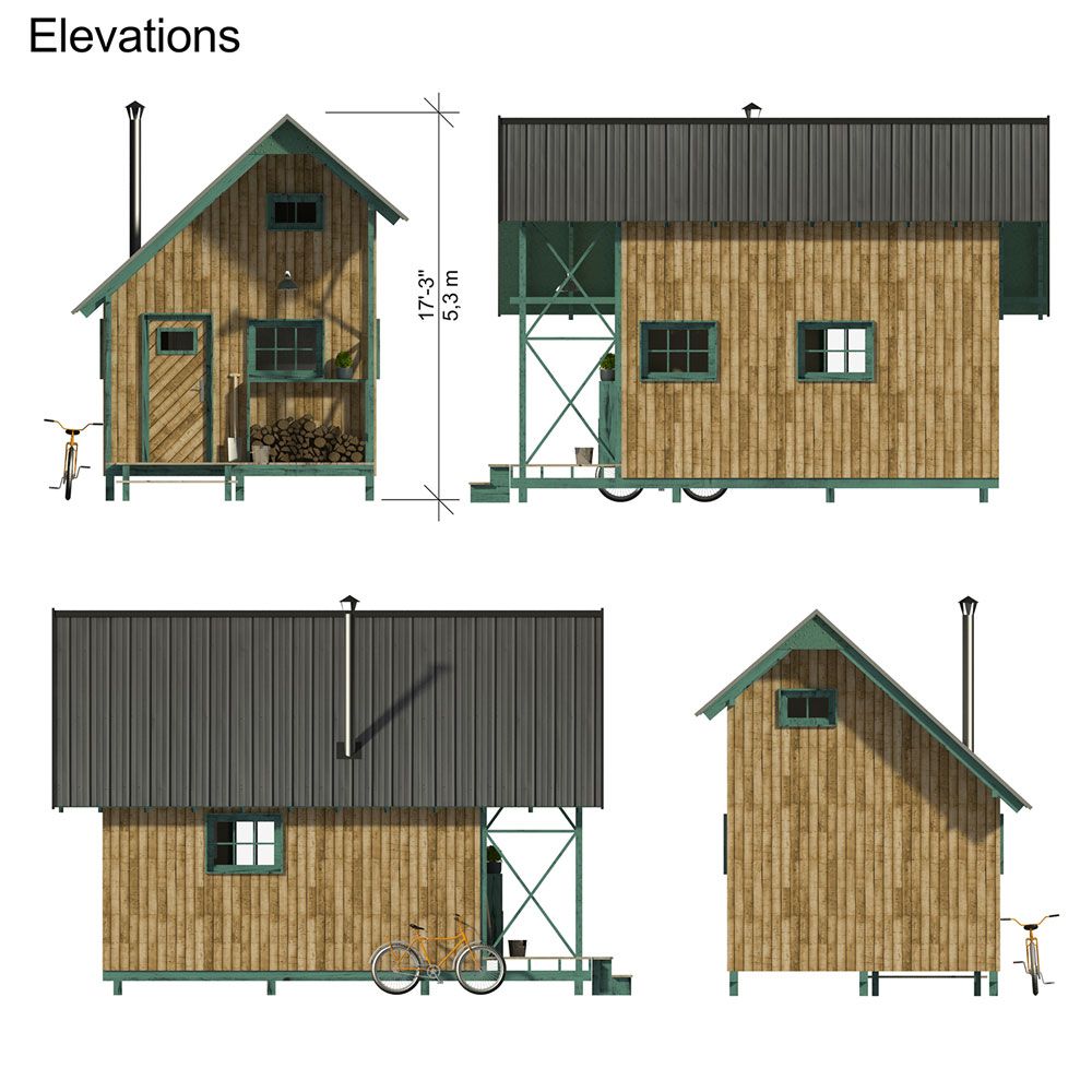 Complete set of one-bedroom cottage plans (pdf): layouts, details, sections, elevations, material variants, windows, doors.