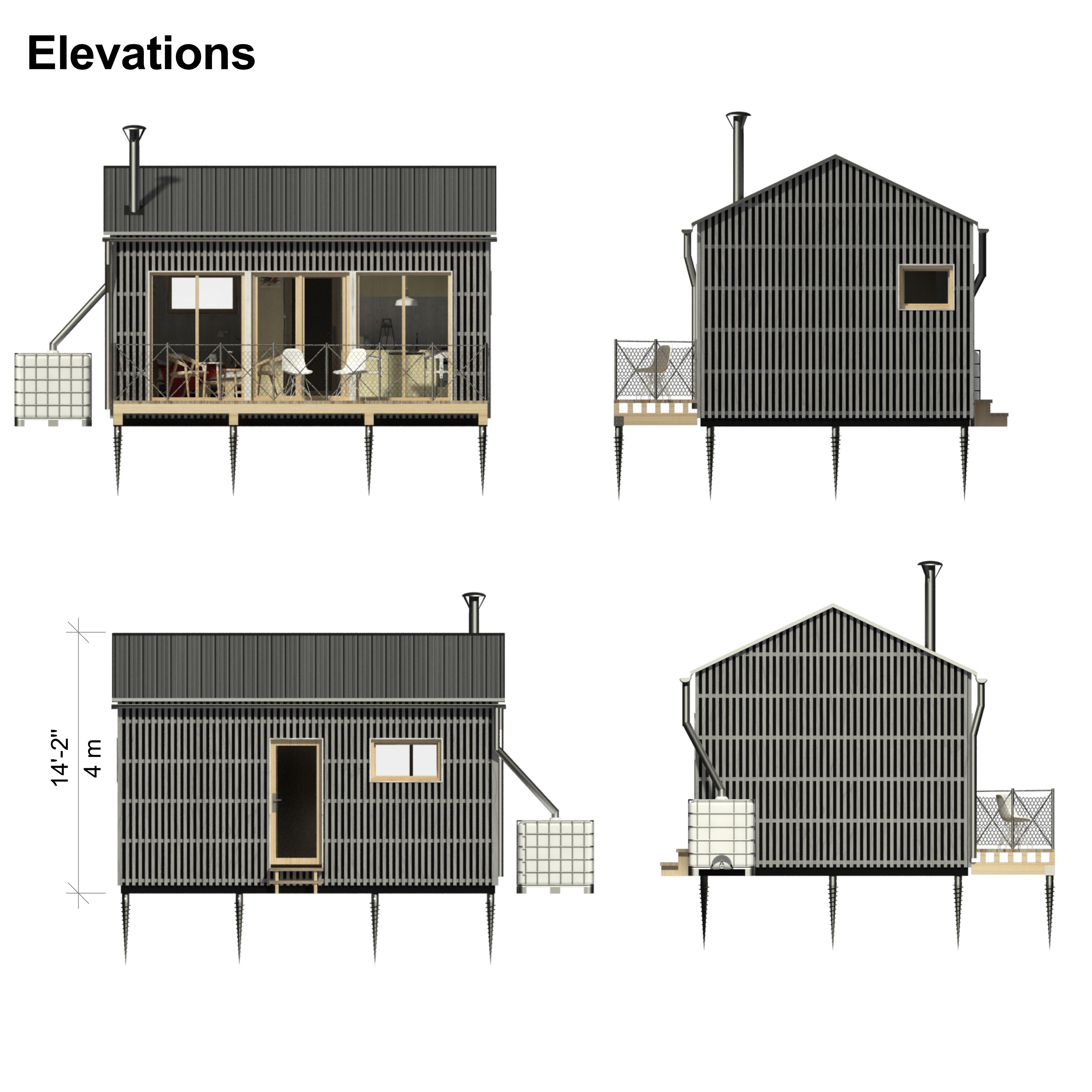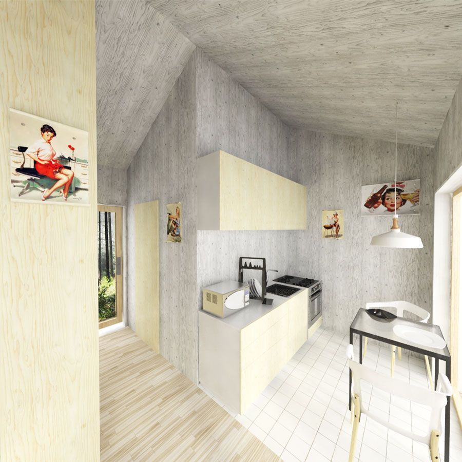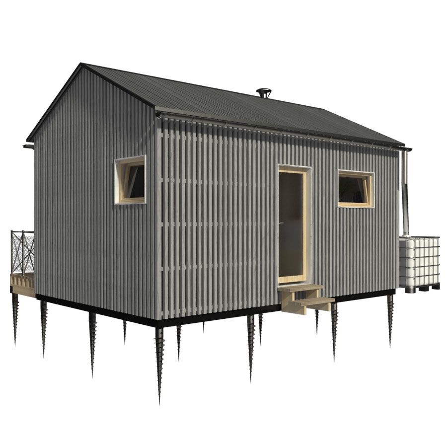 Cloe, this charismatic one-bedroom plan has everything you expect from a small cottage. It is neatly planned out on a minimum space of a built-up area of an unbelievable 32,4 m² / 348,8 sq. ft. This compact version of the cottage also comes with so favored gabled roof shape. For more privacy in the interior, the sleeping area is visually divided by useful storage space. The main room then opens towards the porch through the generous windows that bring enough daylight to the interior. For a more sustainable way of using the cottage, it is possible to add a rainwater retention system or some other features that are to be found on the blog.