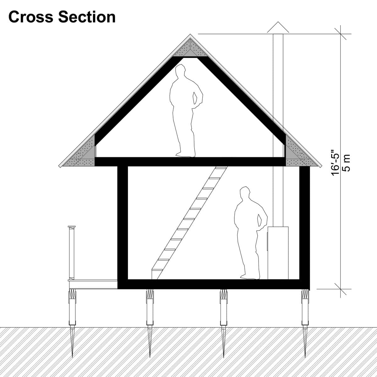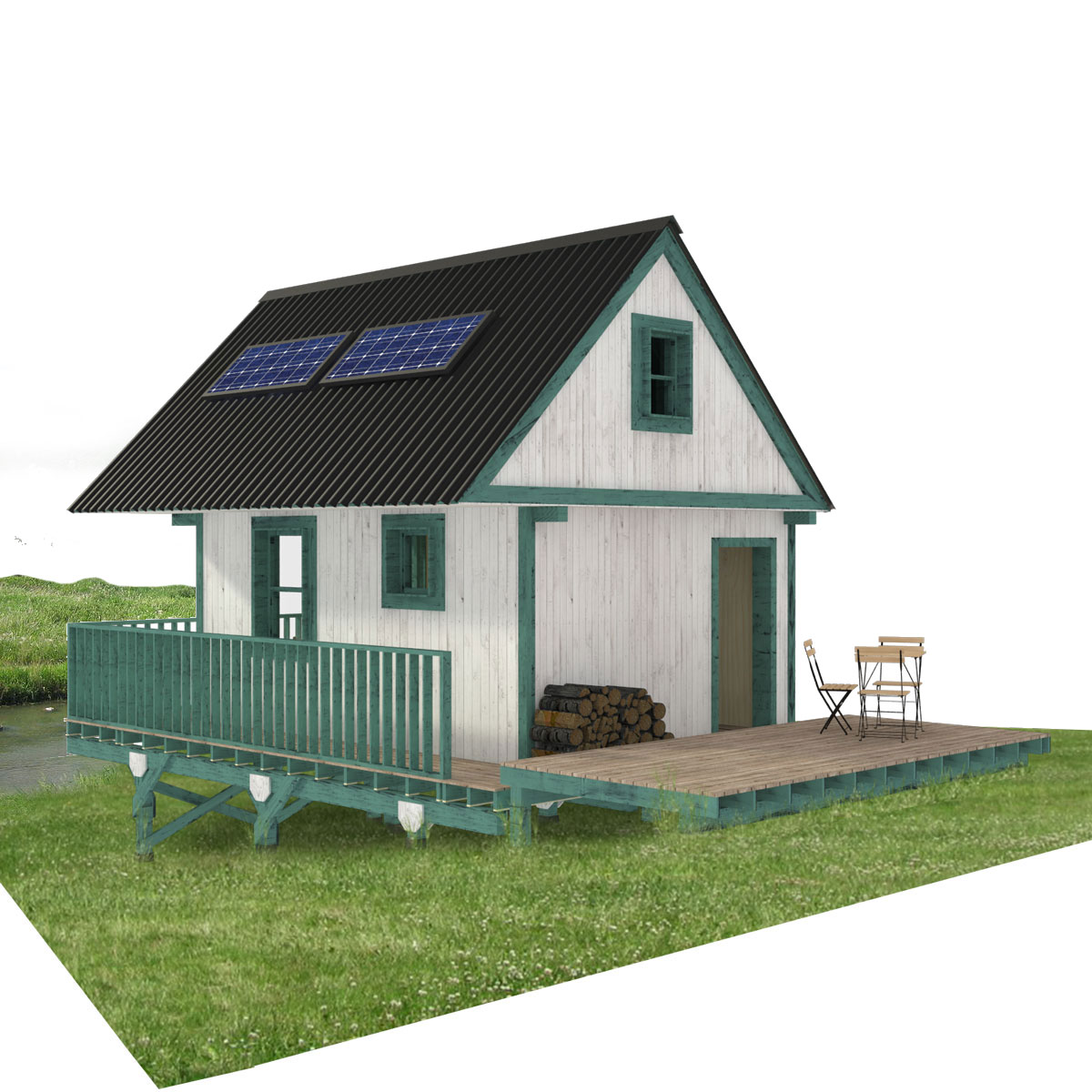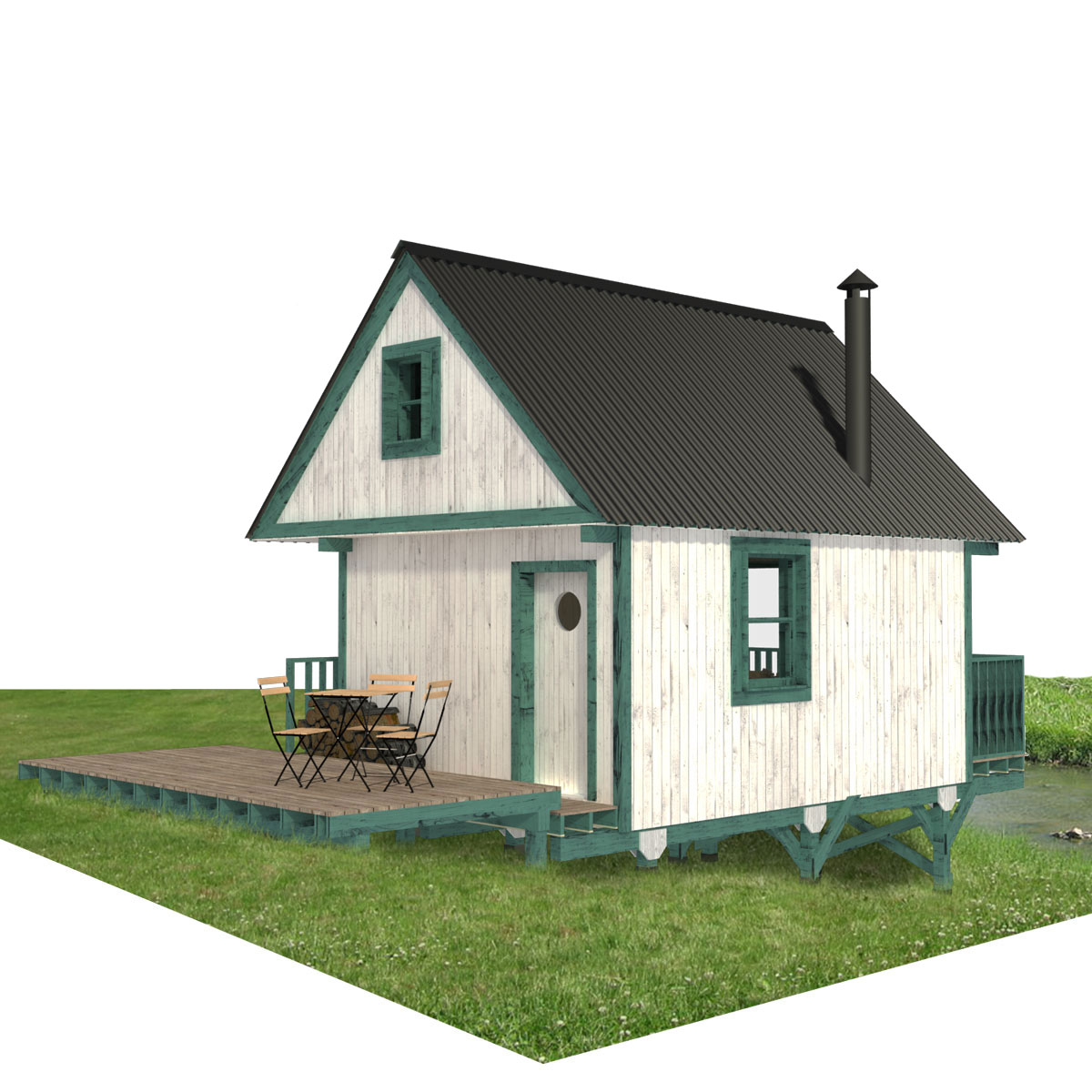 This little riverfront building on columns can be built on sloping as well as on flat land. The partially covered terrace allows a beautiful view of the surrounding area. The interior space is minimally but efficiently arranged. There is a small bathroom, a kitchenette, and a main living area with a fireplace. The loft in the gable roof serves as a sleeping area. At the entrance to the cabin there can also be a terrace with outdoor seating. The roof overhang allows for wood storage. This weekend cabin is suitable for self-construction, its construction is not difficult and can be made in a few weeks. Awaken your romantic soul and your dreams can become reality in a short time.