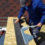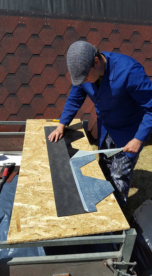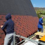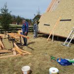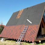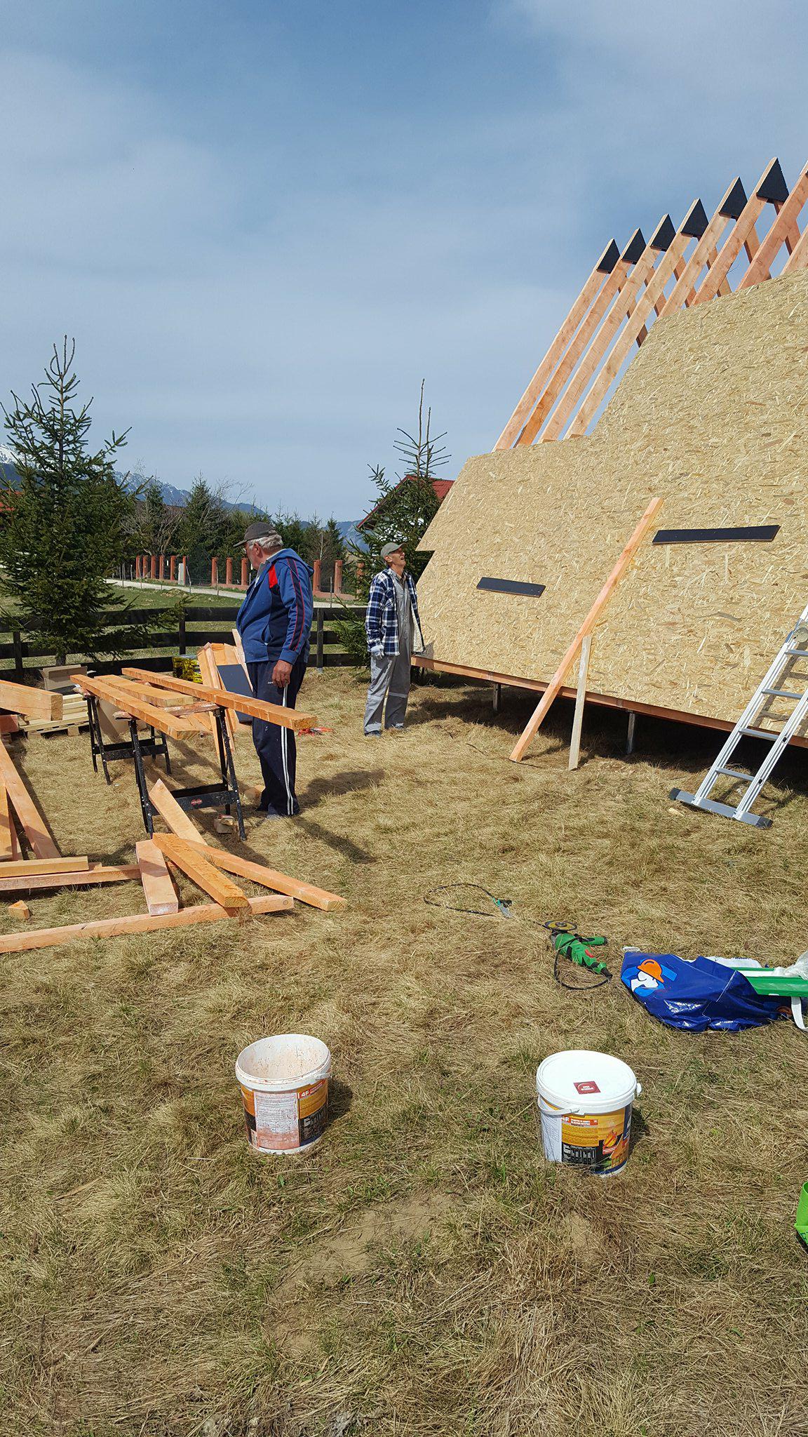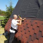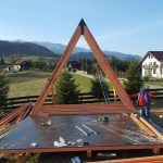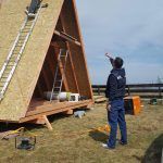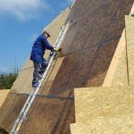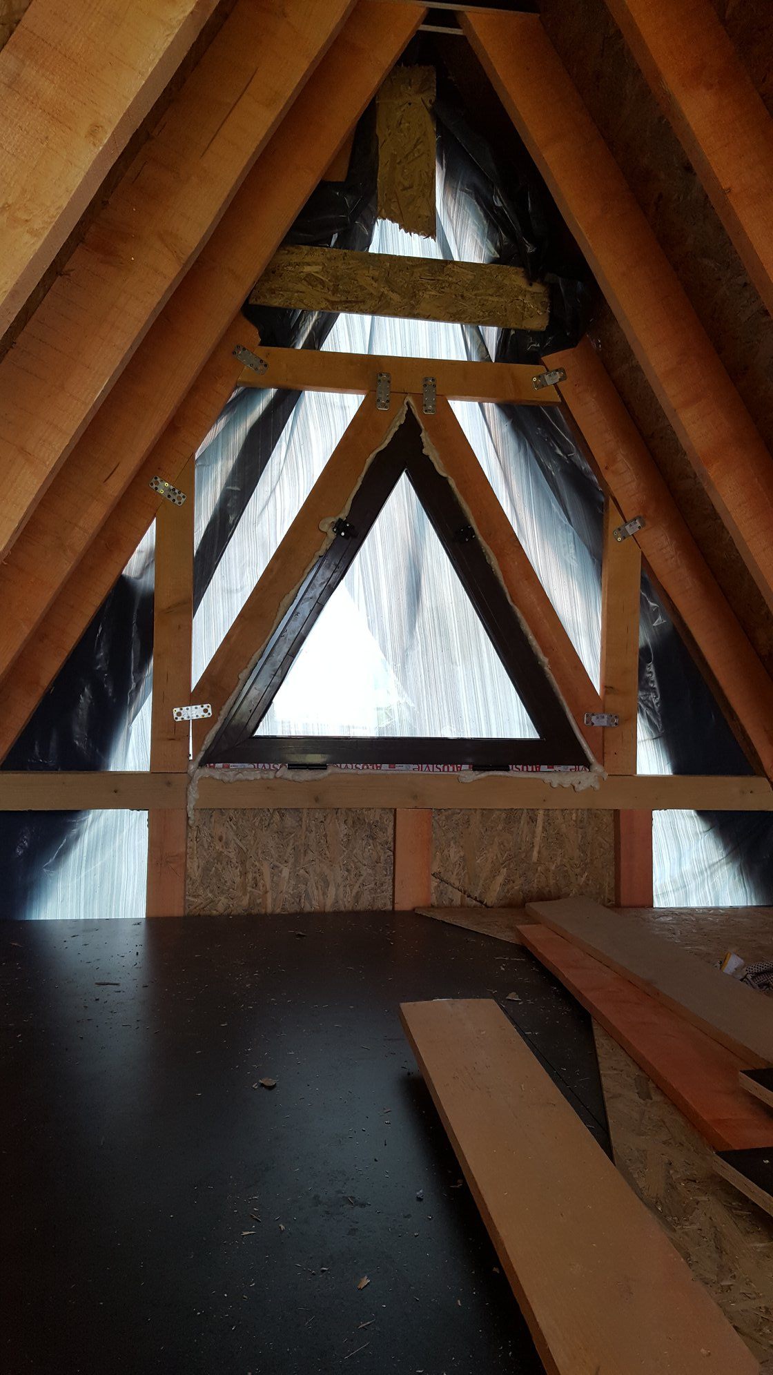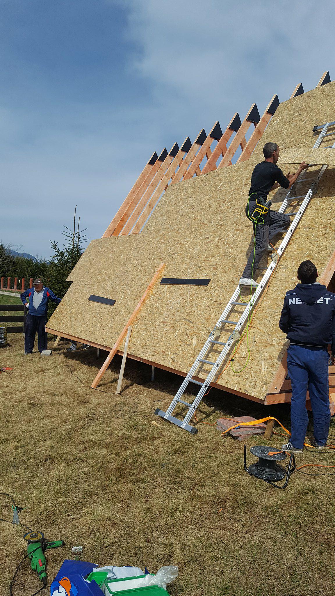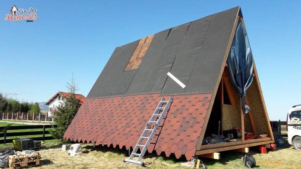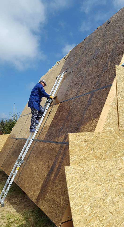 The next stage is dedicated to the sheathing, in the case of Dan’s a-frame house, it is made of OSB boards. These are here primarily to reinforce the construction. It is the best form of bracing for the frames, and they also serve as the baseboard for the roof covering, for which Dan chose asphalt as the main material. Before the OSB boards were assembled and installed, they were coated with a special formula to prolong their lifespan. Once the OSB boards were tempered, hydro-insulation was placed on them. In the pictures below, it is the black film. Once that was done, and asphalt roof-cover was attached.