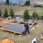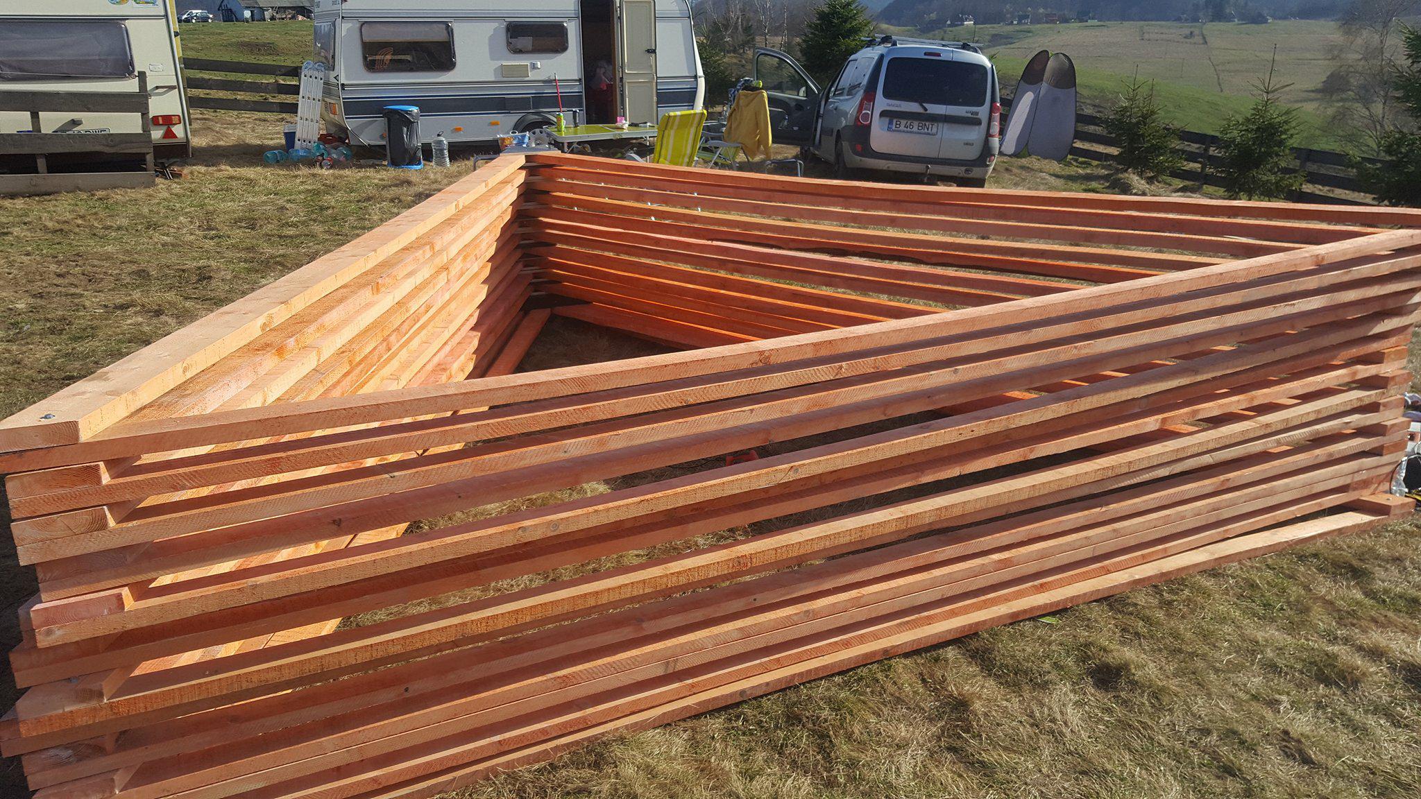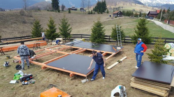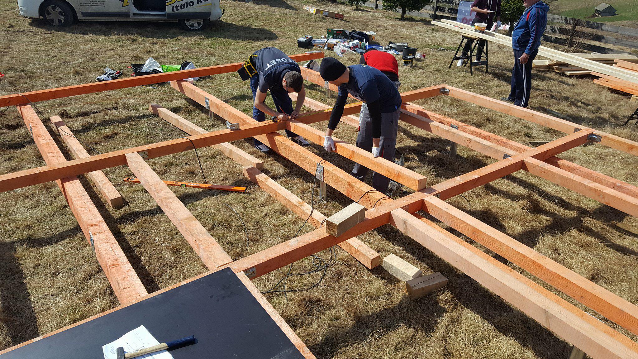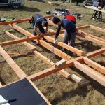 Once the ground screws are aligned so that they are perfectly even, it is time for multiple joists. The joists were coated with a special formula to protect the wood from mold, fungus, and other dangers. On the joists came floor joists, on which then came black baseboards. The baseboards later came in handy as a platform for building triangular wall structures. If you would like to know more, such as what the floor joists’ ideal span is, have a look at pages 100-101 in the guidebook, or check out the blog entry dedicated to floor span.