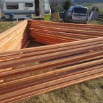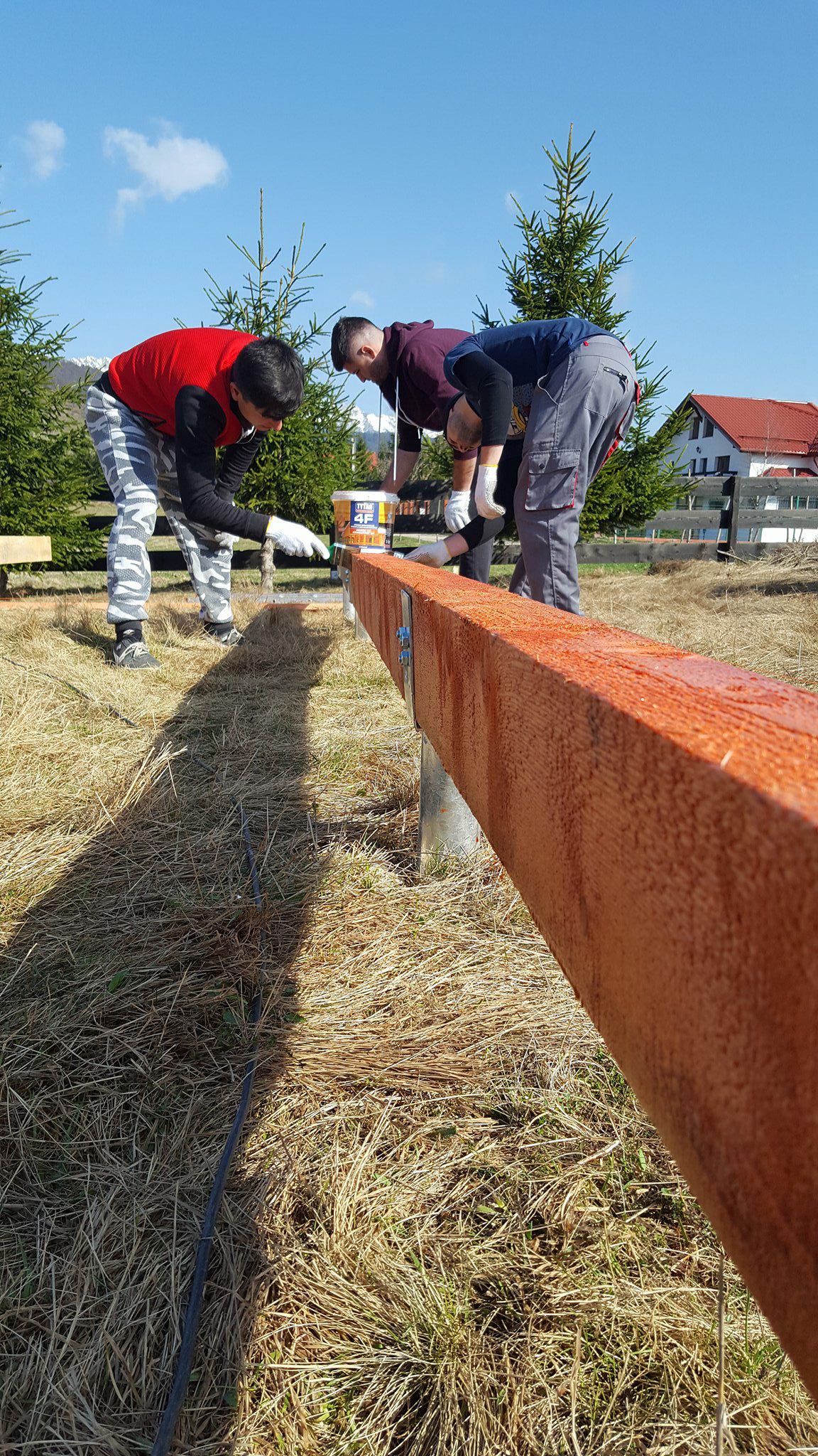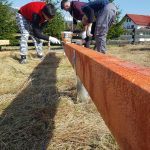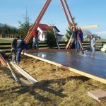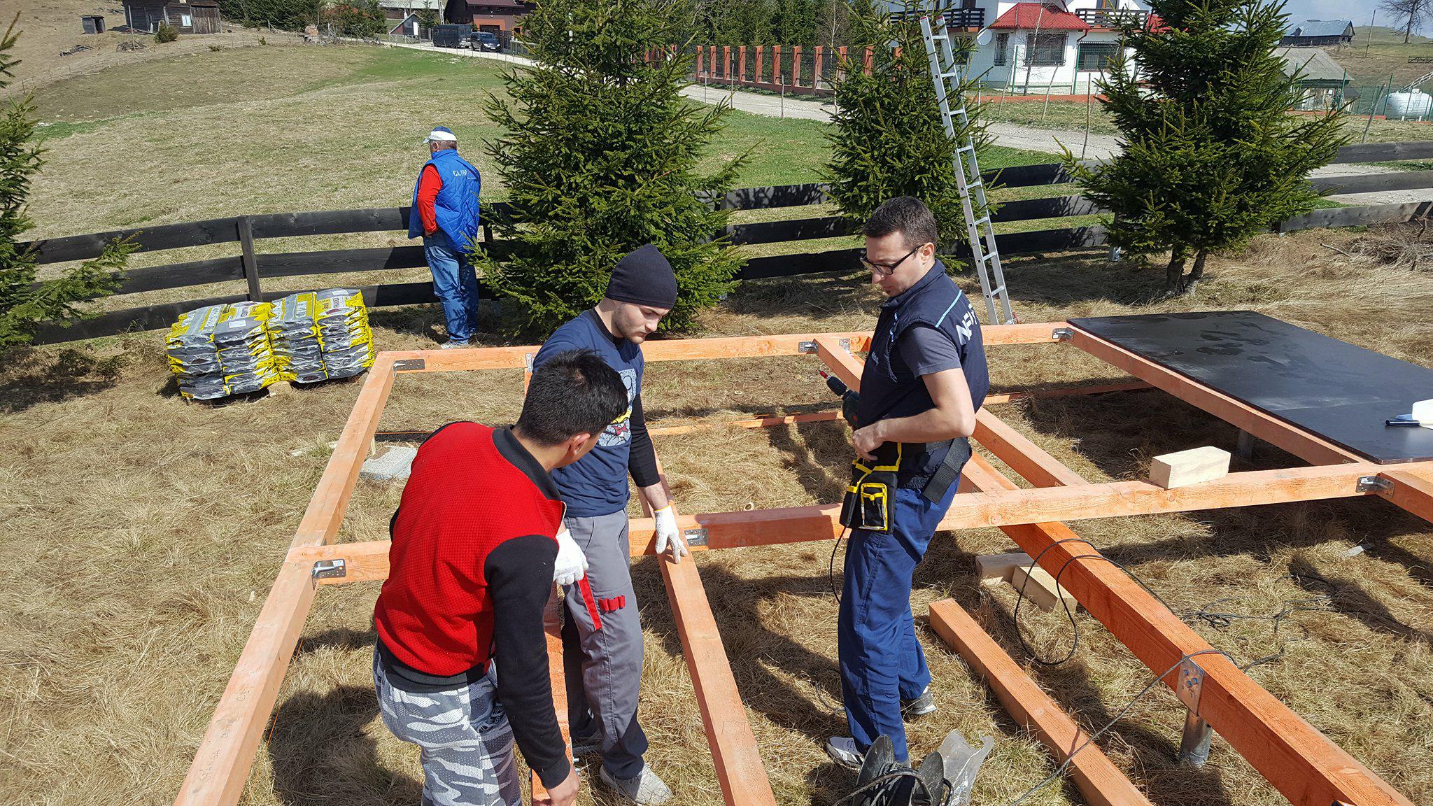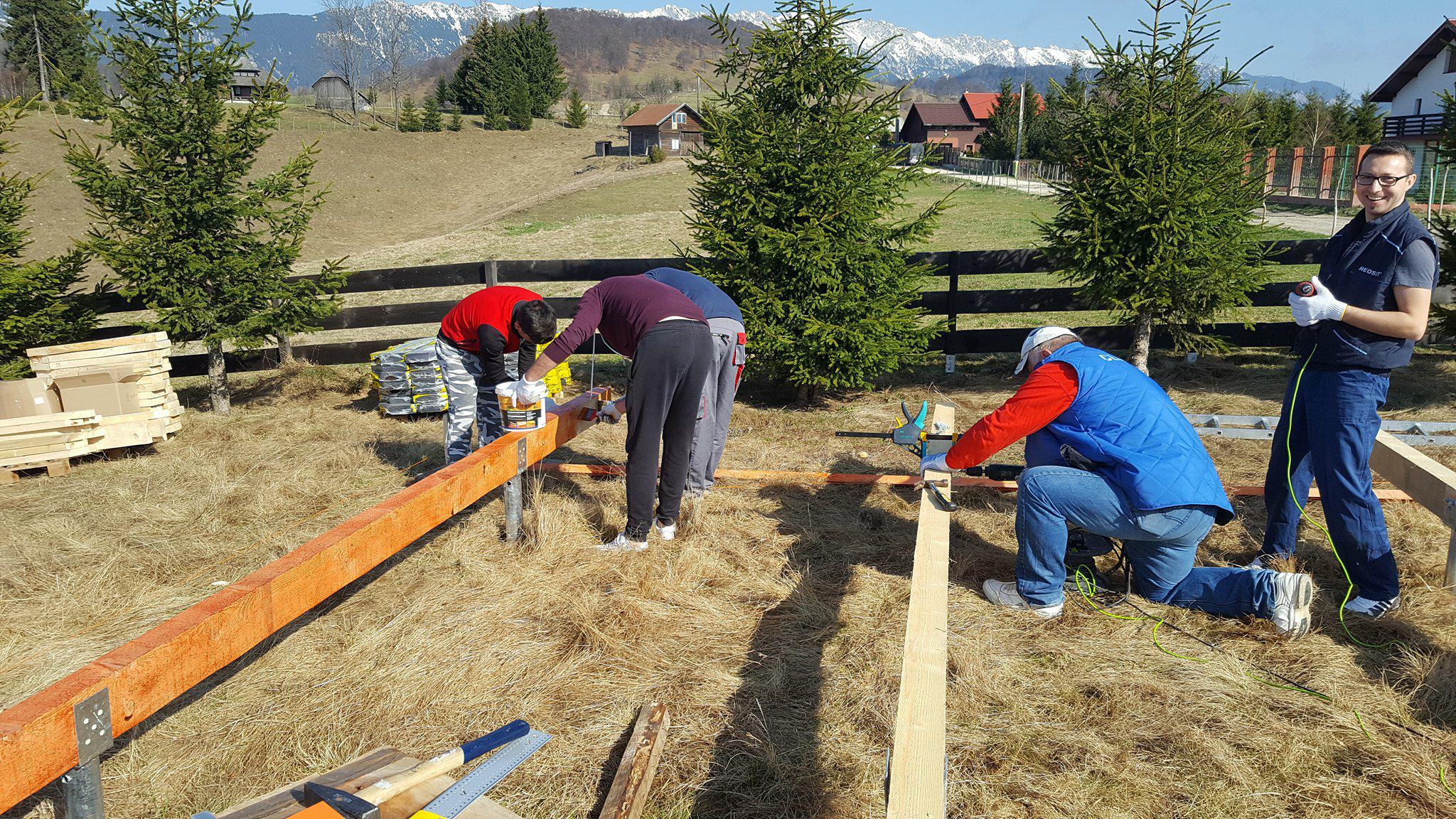Once the ground screws are aligned so that they are perfectly even, it is time for multiple joists. The joists were coated with a special formula to protect the wood from mold, fungus, and other dangers. On the joists came floor joists, on which then came black baseboards. The baseboards later came in handy as a platform for building triangular wall structures. If you would like to know more, such as what the floor joists’ ideal span is, have a look at pages 100-101 in the guidebook, or check out the blog entry dedicated to floor span.