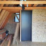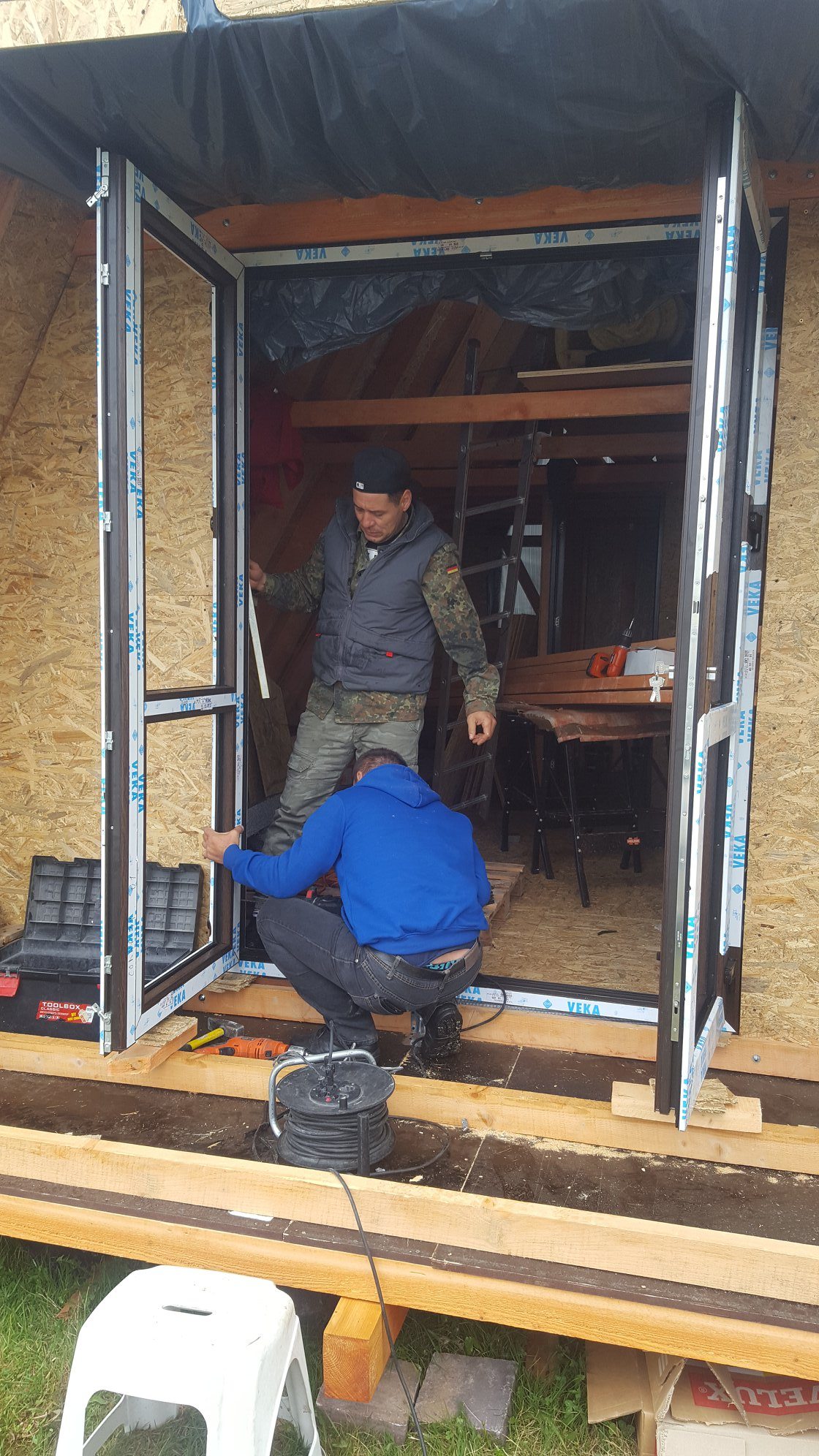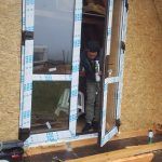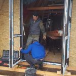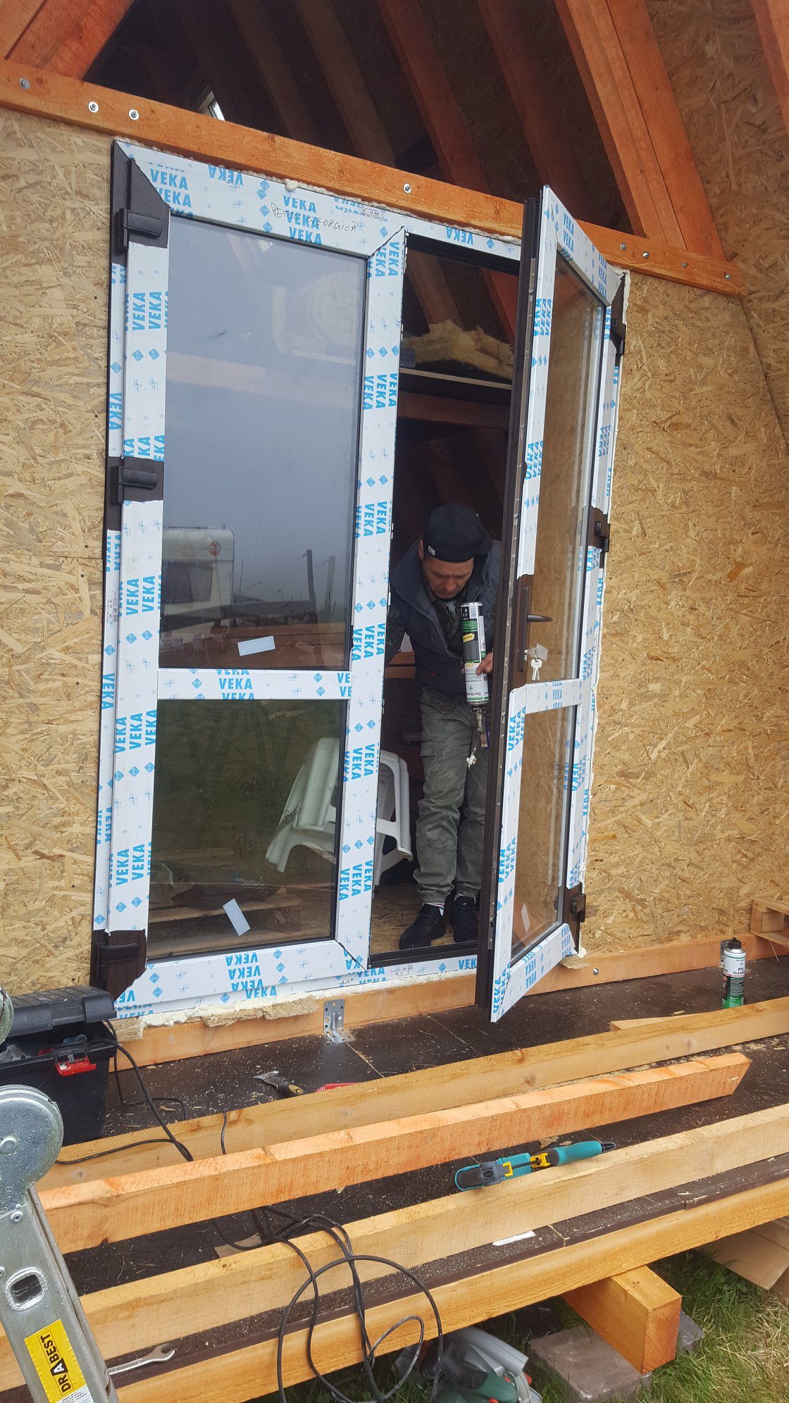 When you are done with the wooden constructions and wall framing, you can install windows and doors. Creating these openings is described in good detail in the book How to build a tiny house. However, it is advisable to leave the window and door opening for later, as they may get damaged during the building process. Until then, provisional doors and windows can be filled into the openings instead. You can make them from OSB boards and simple joints; it is a matter of only a few minutes’ work. In the pictures below, you can see protective films are still on the windows. These are better kept until the end of the building process as they protect the installed windows and doors.