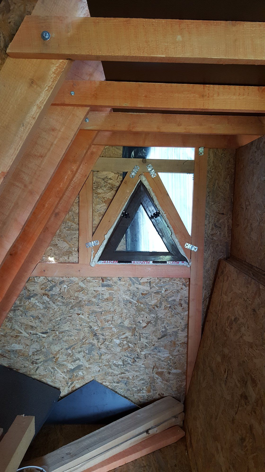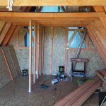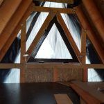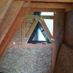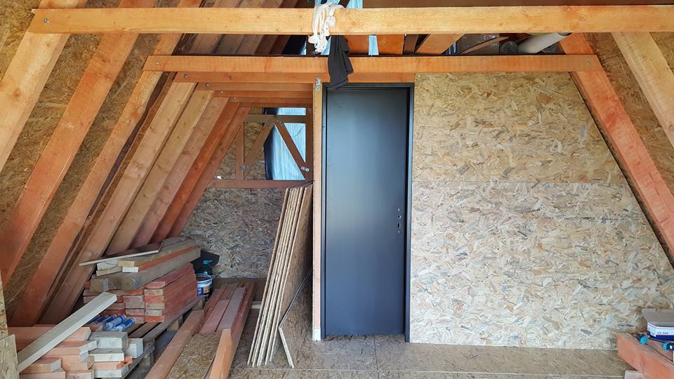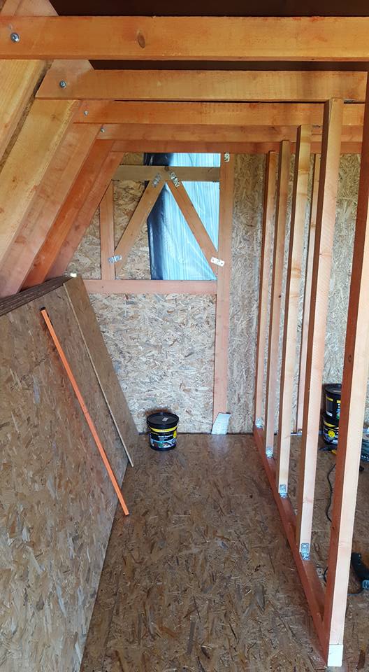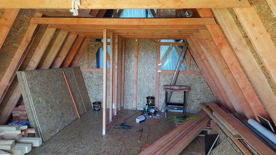 The bathroom is divided from the rest of the house’s interior, with partitions made of wooden joists and OSB boards. These partitions do not support the house’s structure. They divide the space. In this picture, you can see the timbers which join together the individual A-frames. These are important, as they serve as the reinforcing of the entire structure and hold a tiny attic where Dan will lay his head.