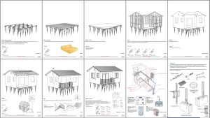 Complete set of Small Bungalow House Plans with Loft Bedroom (pdf): layouts, details, sections, elevations, material variants, windows, doors.