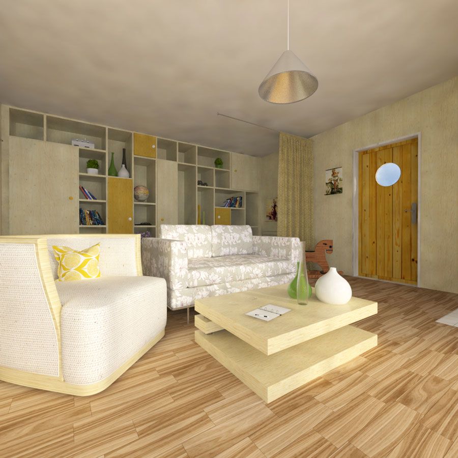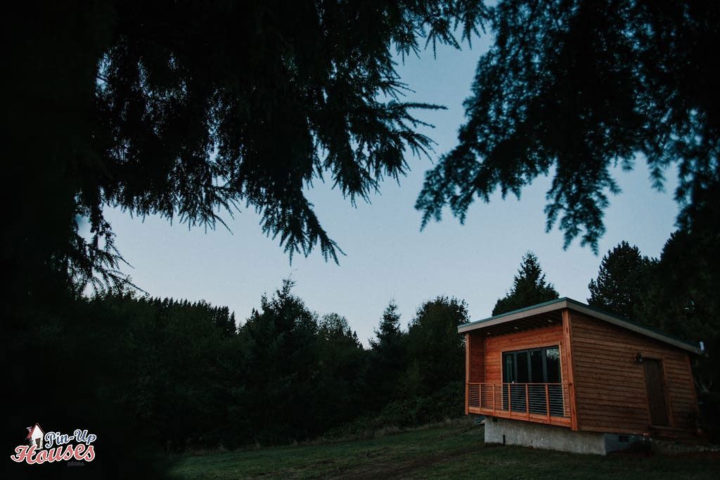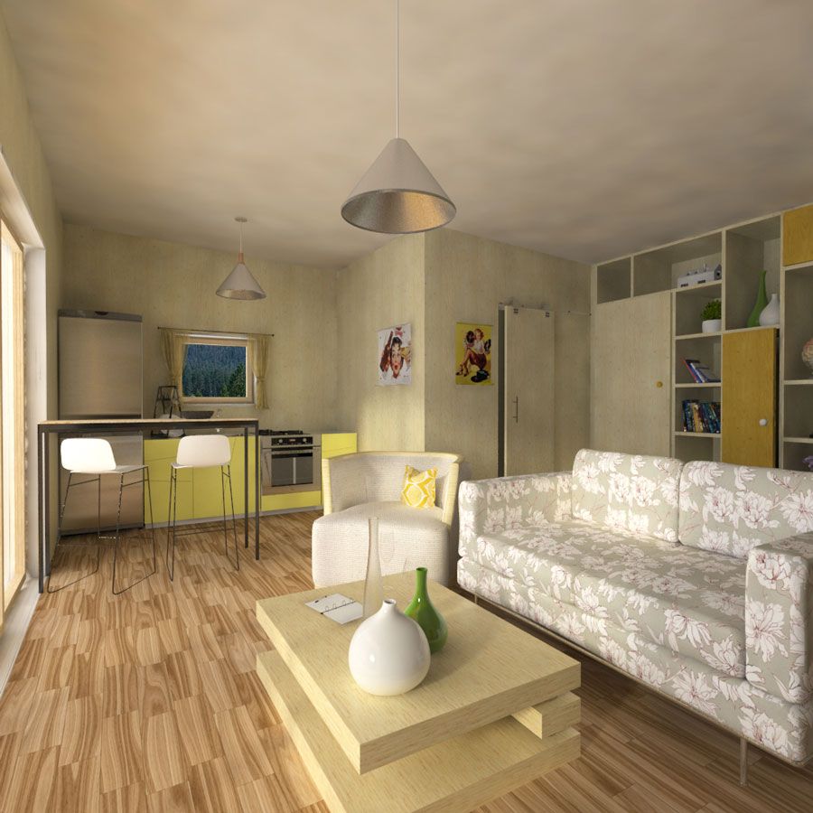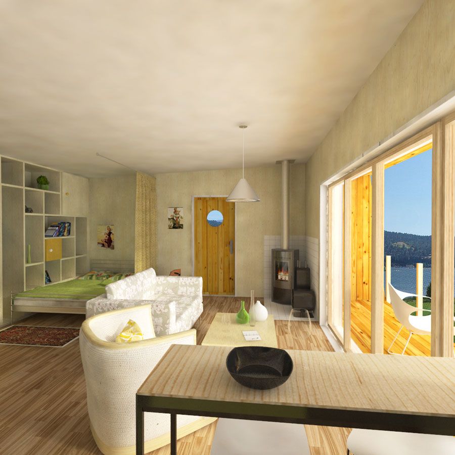 Lisa is a small wooden flat-roof house that combines minimalism with space-saving solutions for efficient use of the room to provide ample storage space with enough comfort for you (for more info about space-saving options, visit our blog here). Lisa is a single-bedroom one-story house with a porch. The main room is a combination of a bedroom, a kitchen, and a living room, with a great view provided through a huge glass door/window. This does not mean, however, that the design does not come with a bathroom. The bathroom is conveniently hidden in the inner back corner and reserves enough space for your comfort without using up too much of your living room’s space. Moreover, if you’d like to, you can divide up the rooms to your own needs, through the carefully-considered placement of partitions, you can find out more about this in our book. Finally, the porch provides enough room for a small table and a few chairs and is sheltered by the house’s roof. Considering this tiny wooden house’s size, this design is ideal for an individual or as a recreational house for a couple, or as a permanent living for couples or individuals. The design’s character blends perfectly with various types of surroundings, from the woods, through gardens, to residential areas.
