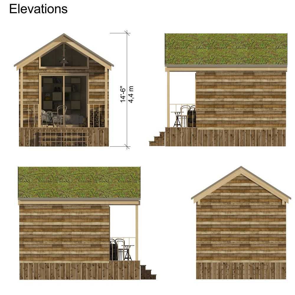 Complete cabin plans (pdf): layouts, details, sections, elevations, material variants, windows, doors.