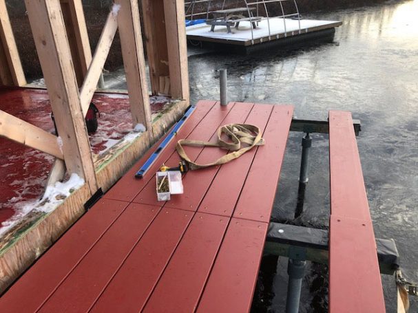Here are a few pictures of my permanent 30 yr life expectancy decks. 2×10 inch dry hemlock planks double-coated with Sickens stain. They are fastened with new generation GRK self-tapping fasteners in 6 x 6 in larch timbers. Each lag has a pulling holding strength of many hundred pounds ( 4 inch threaded in larch beams. The floating structure in the background is a mobile veranda on which to practice thai chi or yoga and floats on three 18 inch diameter HDPE culvers sealed at the ends. It hitches to my Marlene deck and can be polled in the middle of the lake for fun or a great original party with friends. A propane burner on the raft permits its signature dish, fresh fries, and lots of beer:)