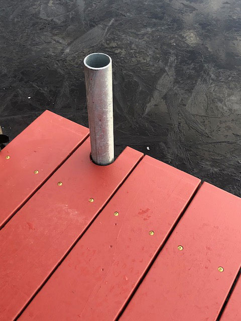 And to compensate for the soft bottom, each leg is adjusted periodically. The top bolt of a bracket is loosened, then a 4 ton come along hand winch is hooked on one side to the top bolt and the other the top of the pipe. By cranking slowly, either the leg sinks more or the floor goes up, the one with lesser resistance prevails. It now sits on hard packed glacial clay deposits and has only moved by a few millimeters since the spring. The bottom of the pipes has a sole, 7 in x 7 in chanel steel segments to bite in the clay and prevent lateral slippage. Once embedded in the muck the 49 sq in the area creates a great suction force to be overcome by floating ice etc. 49 x 14.7 lbs per sq in plus the weight of the cabin and foundation. It will never move ( so I think:) uncertainty makes things fun and challenging.